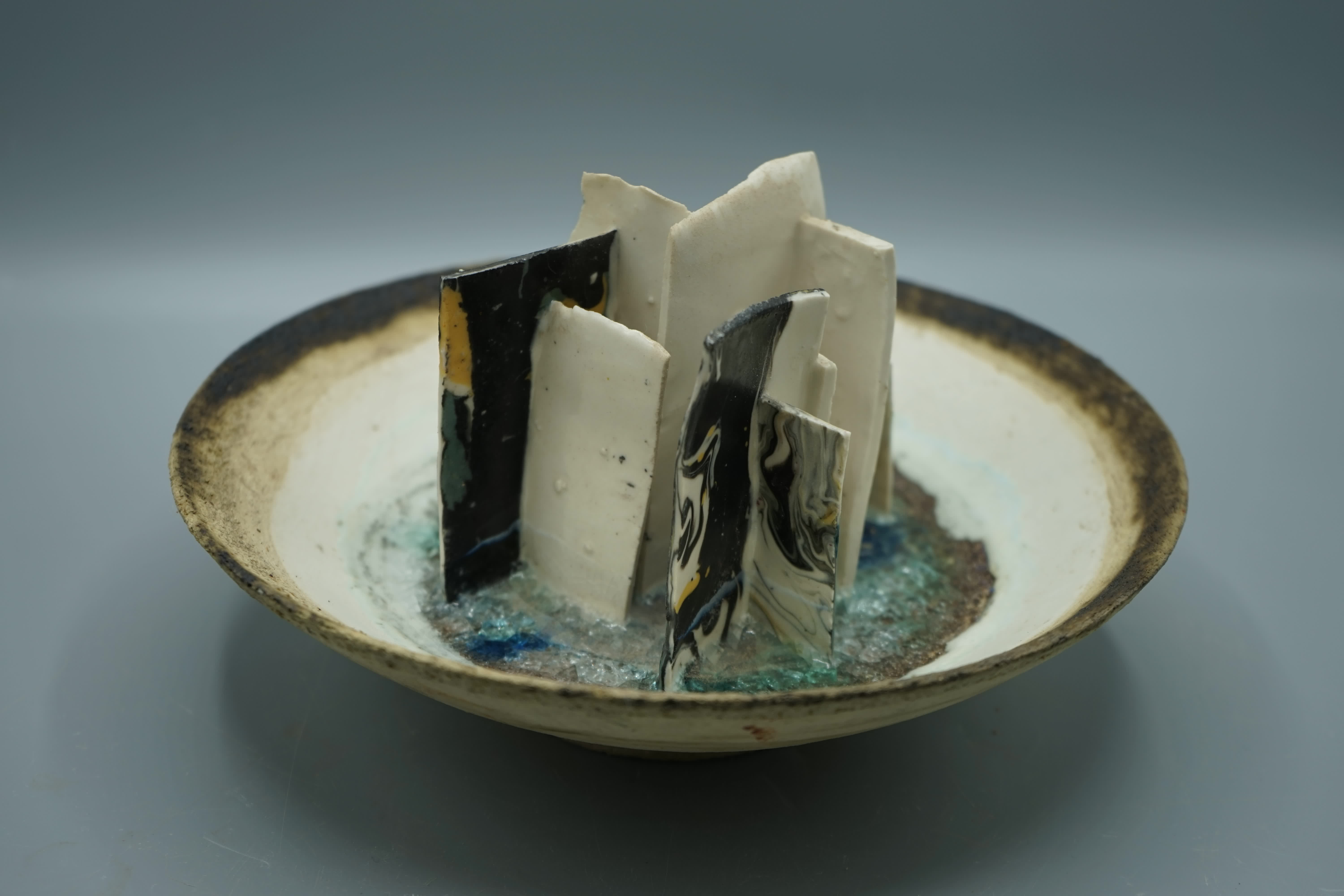 piatto in semire ingobbiato, scultura in porcellana smaltata, base con vettrificazioni