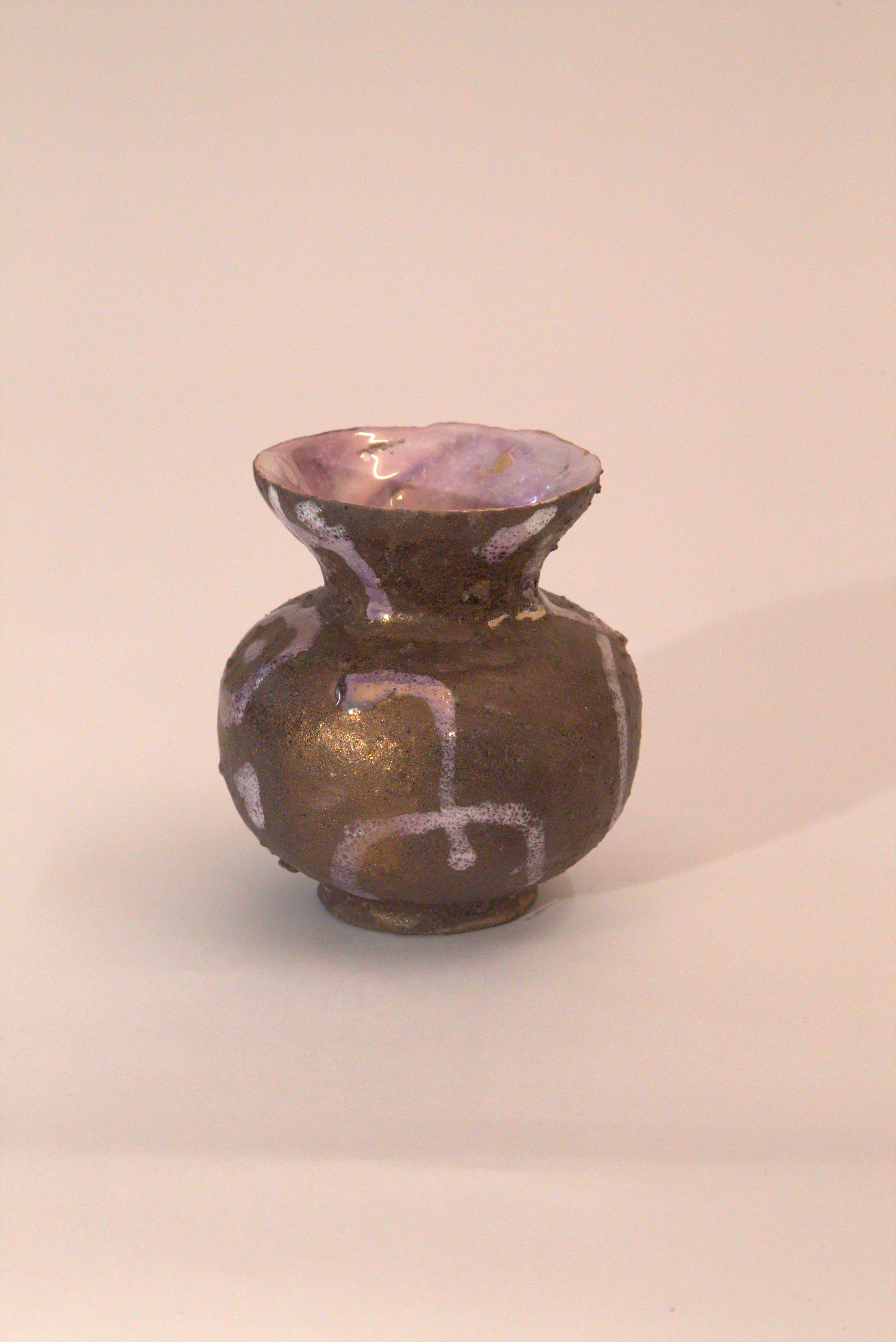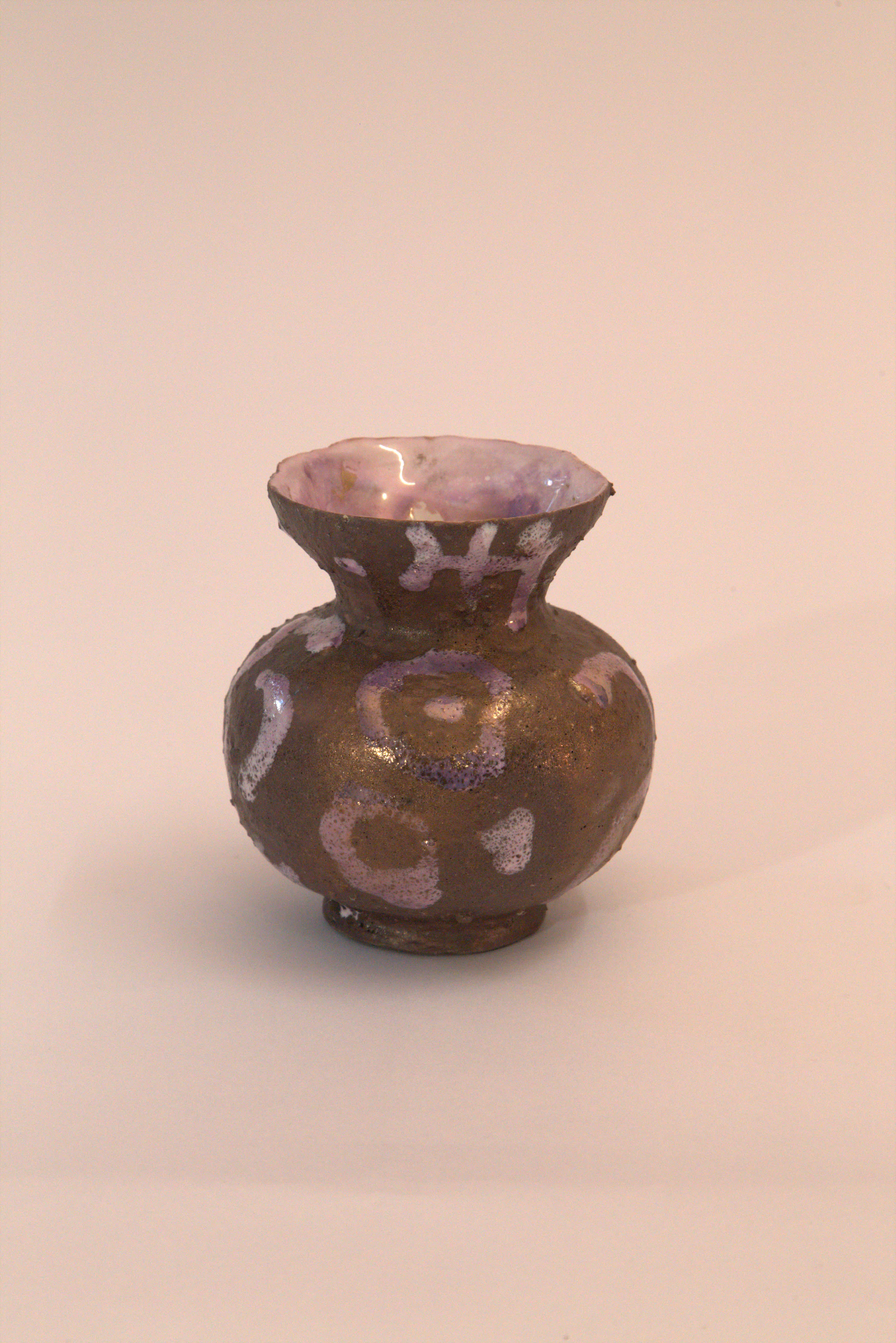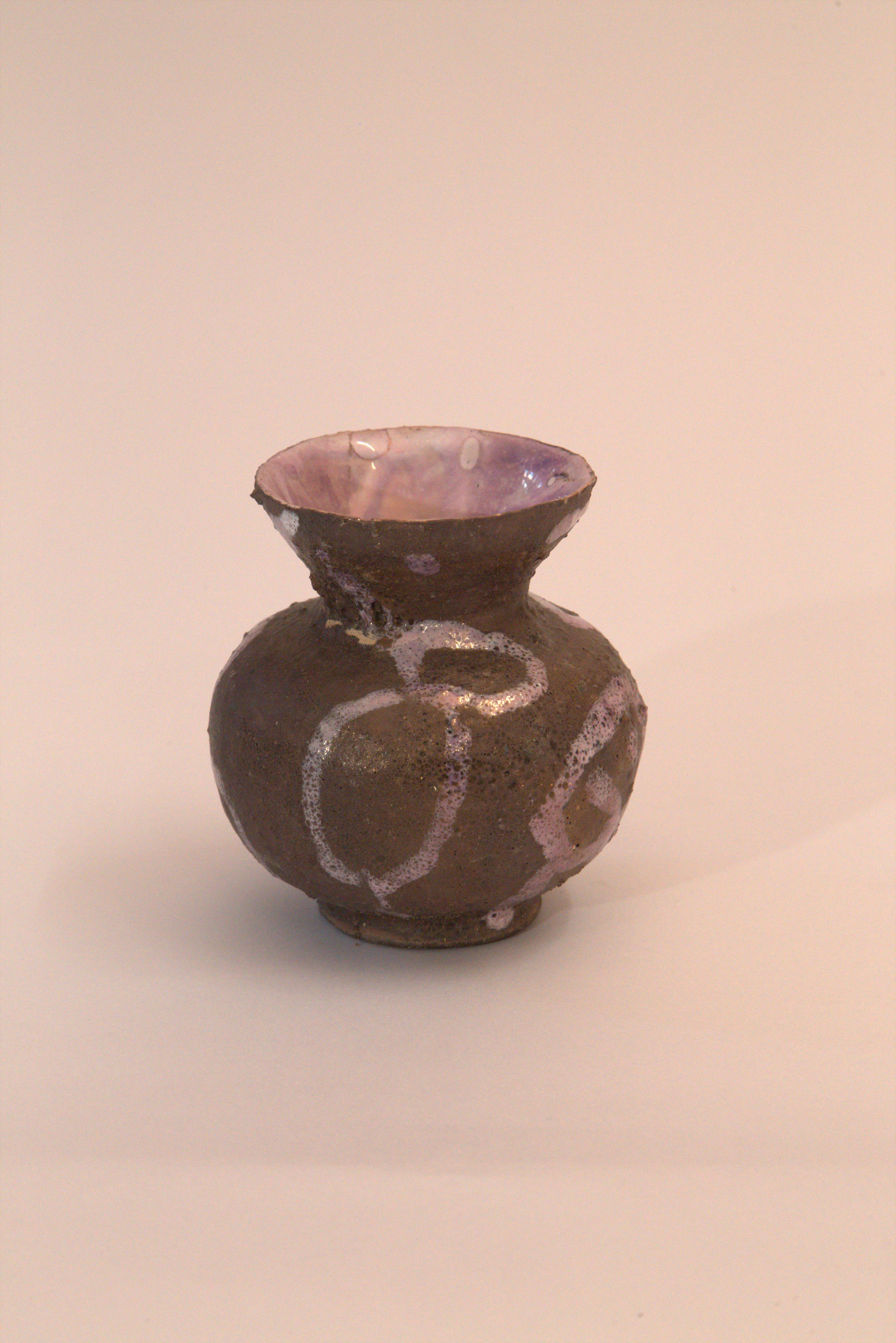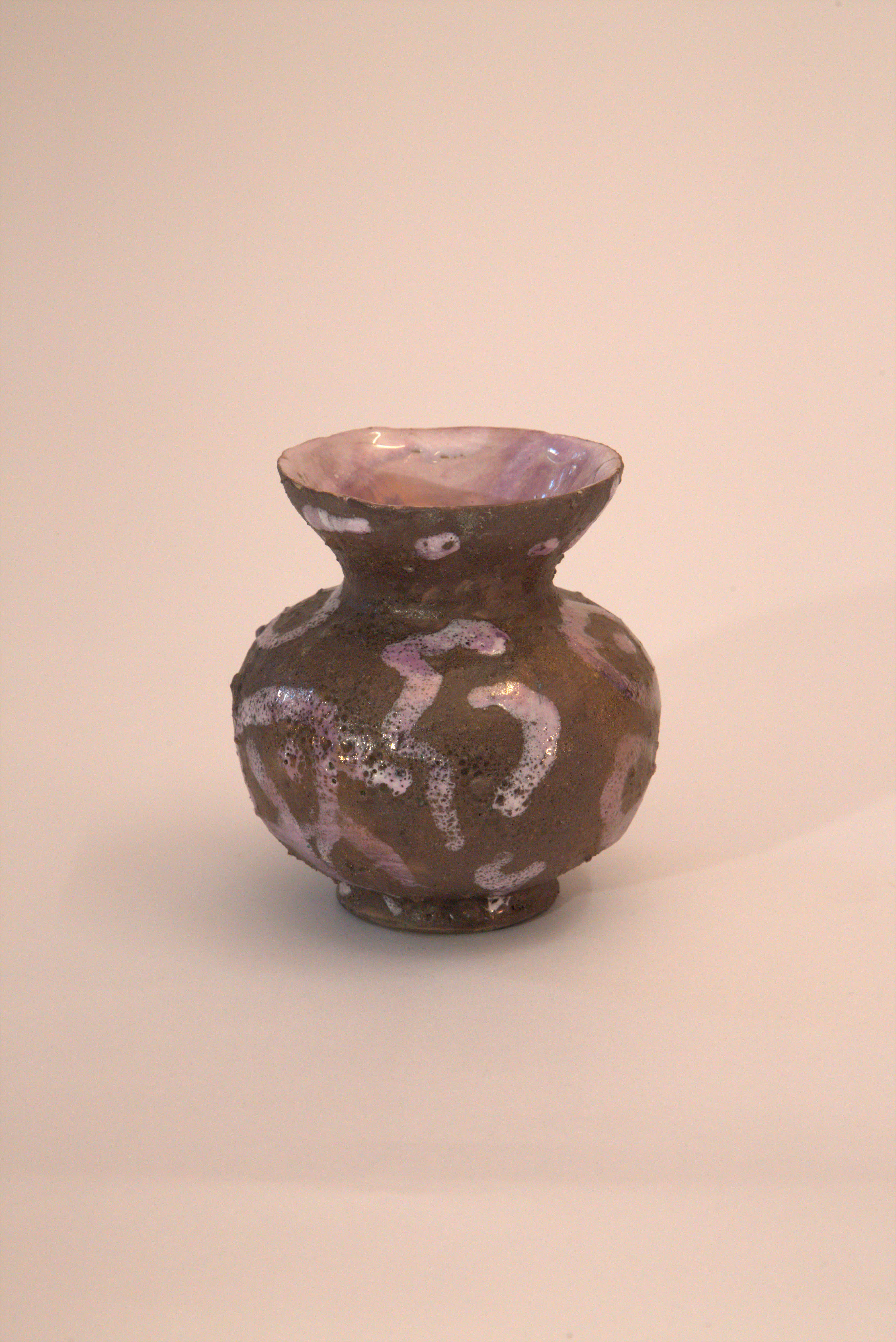 vaso Globulare, collo a imbuto, smalto ruvido con segni violacei, velatura violacea, smalto interno chiaro