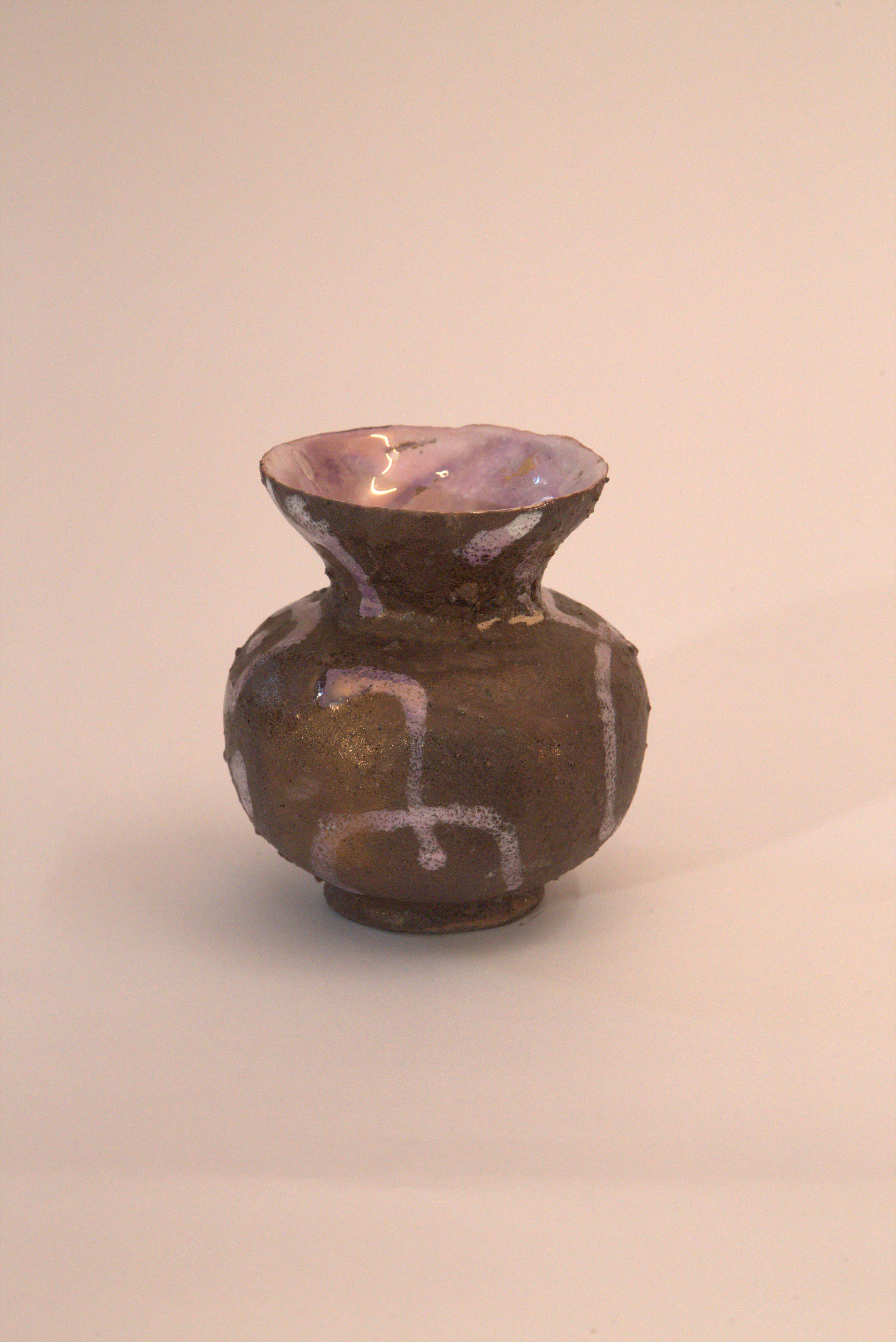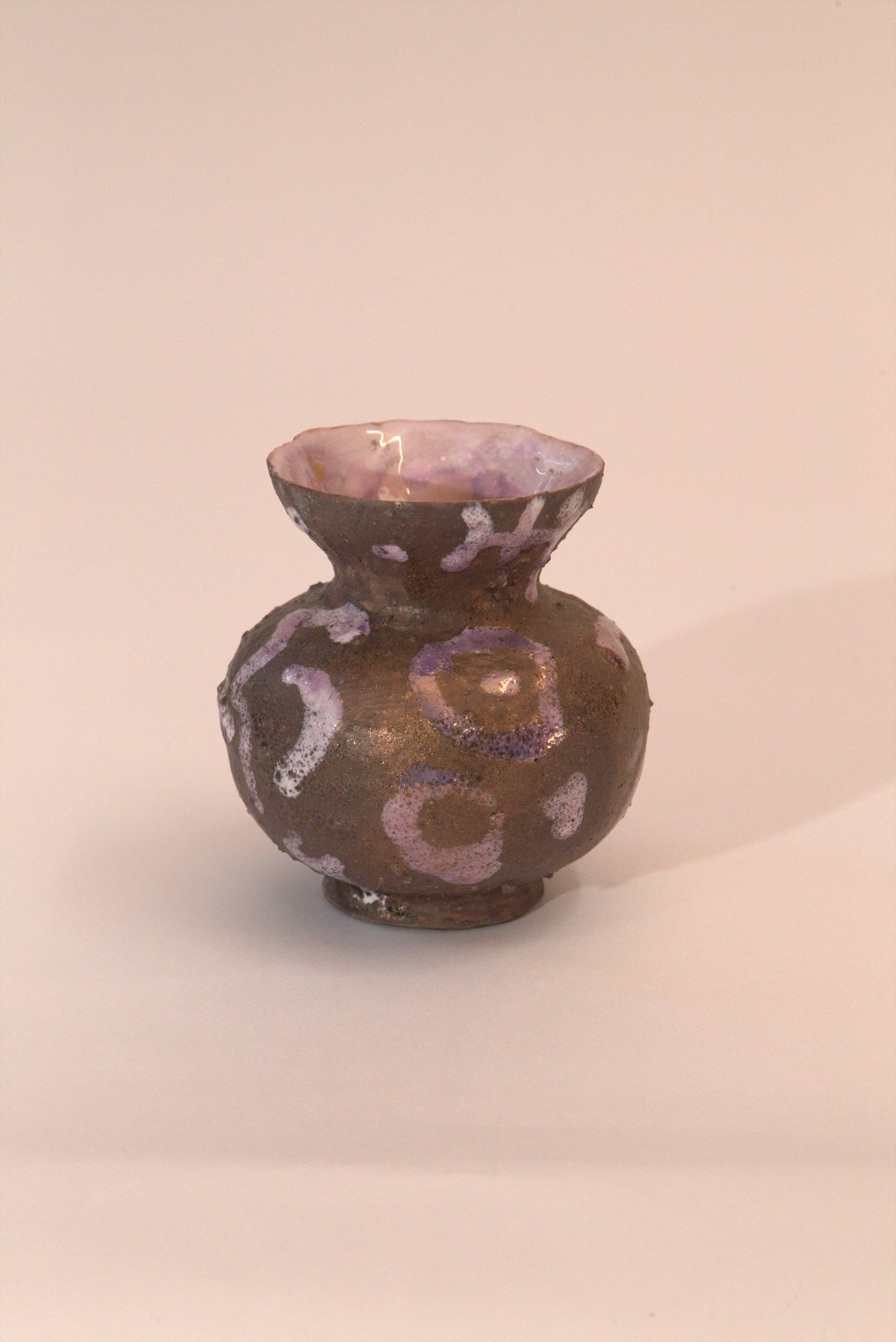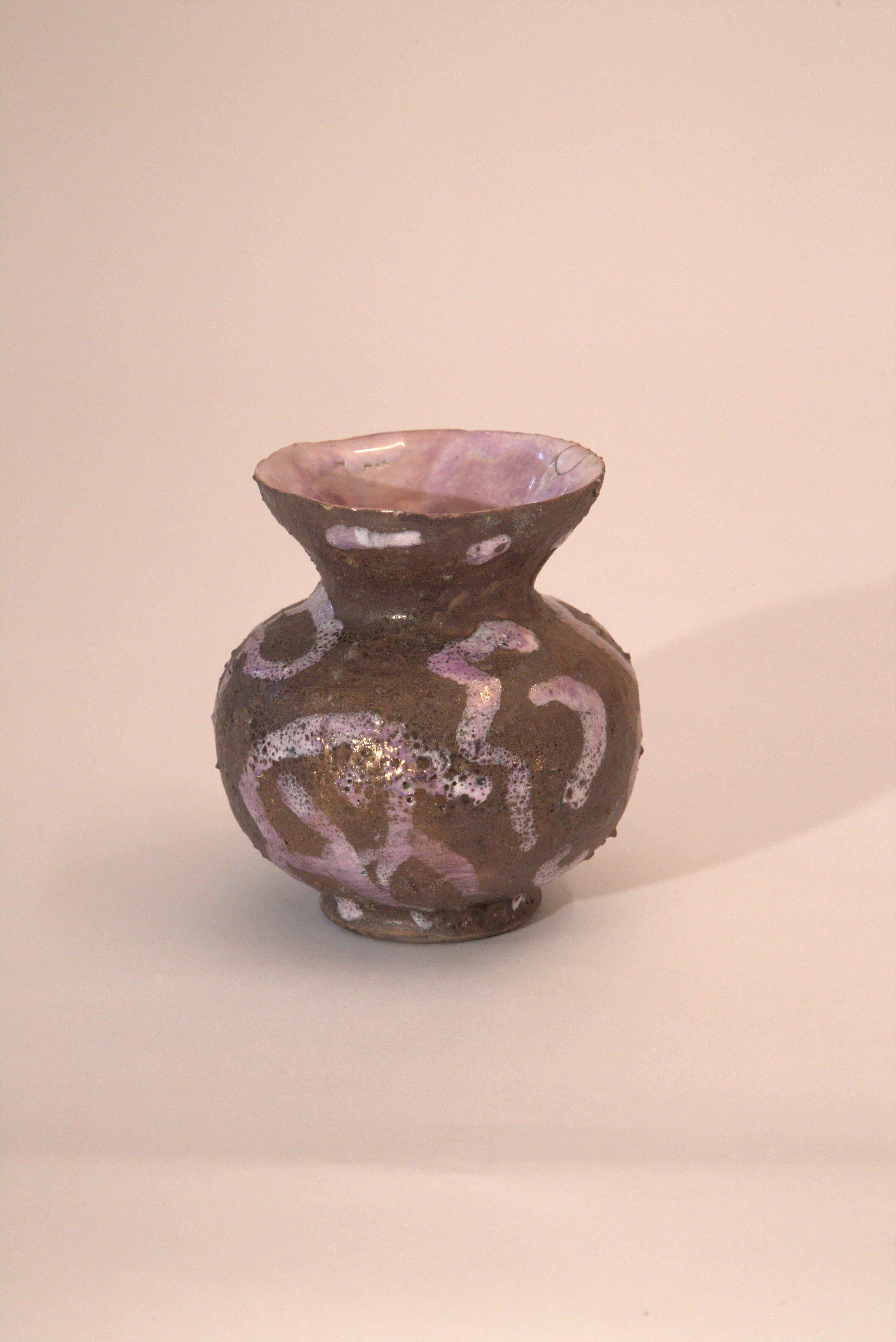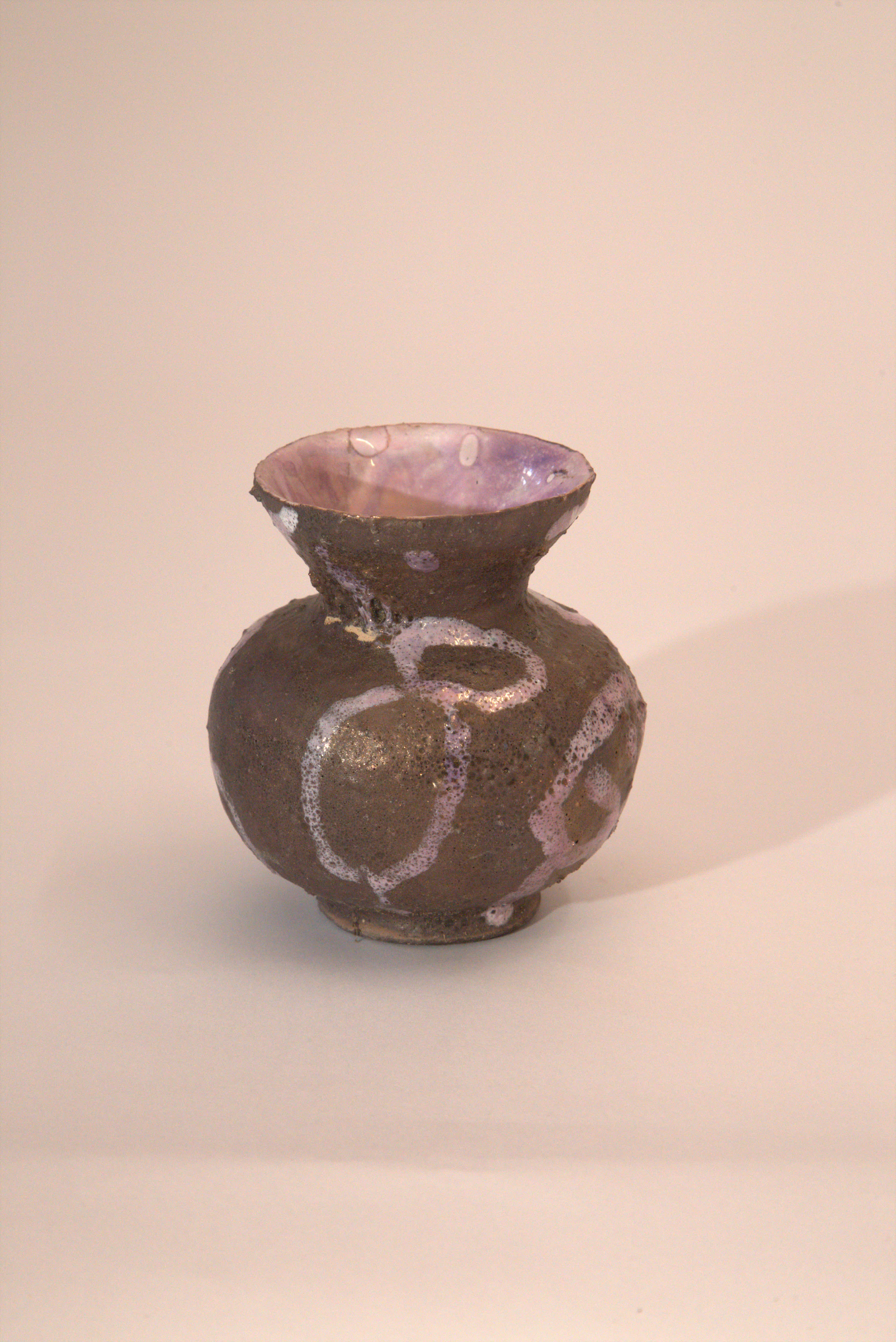 vaso Globulare, collo a imbuto, smalto ruvido con segni violacei, velatura violacea, smalto interno chiaro