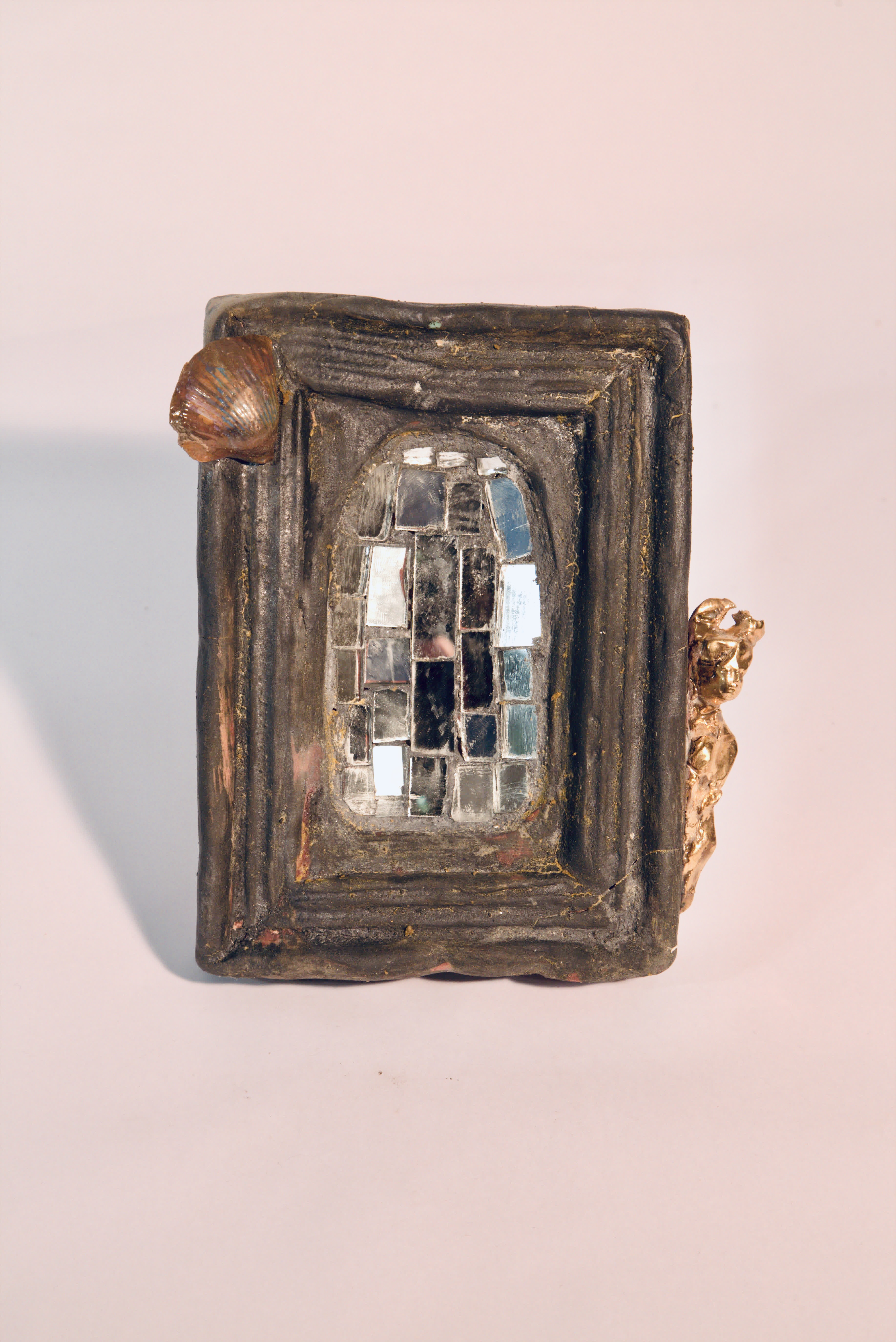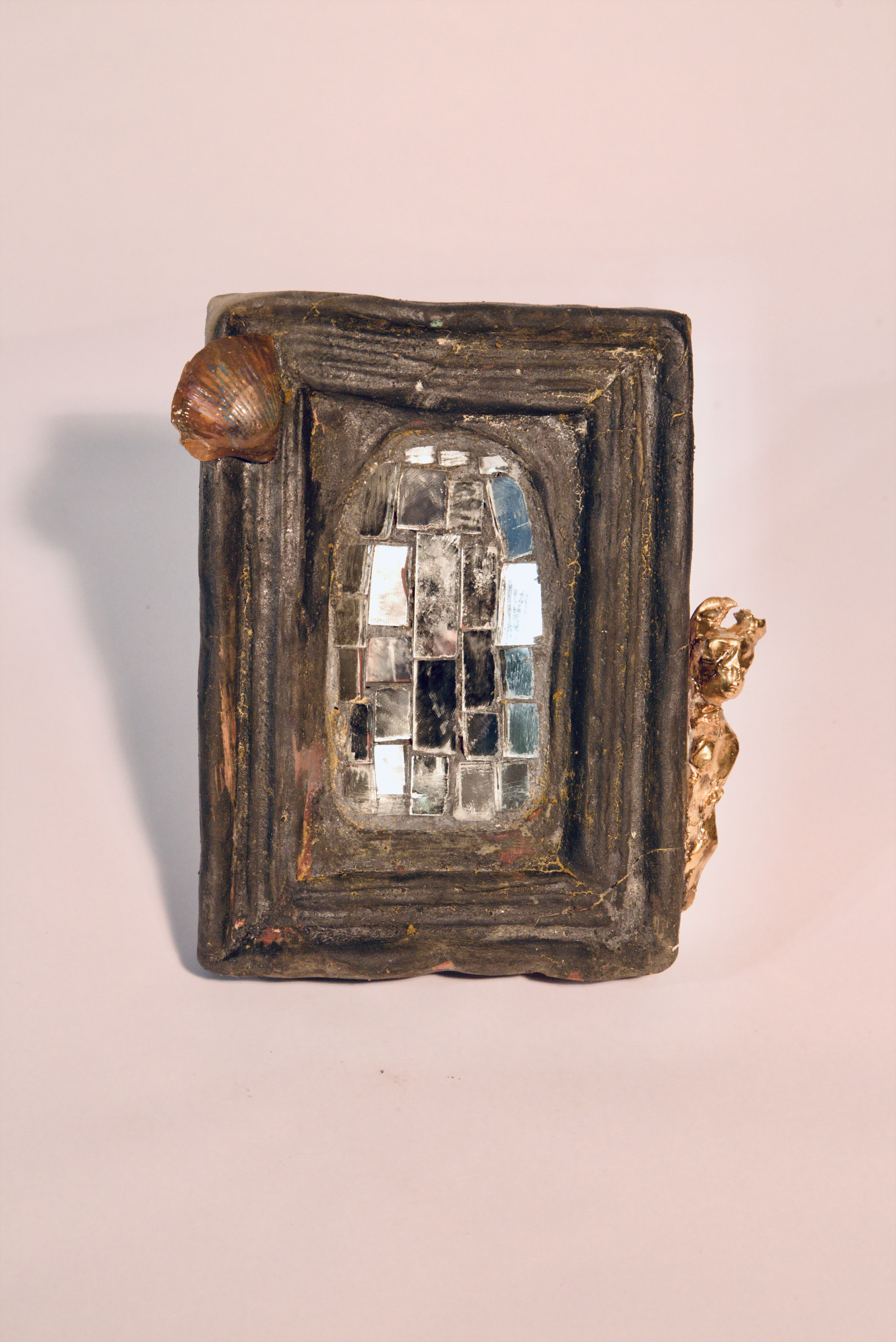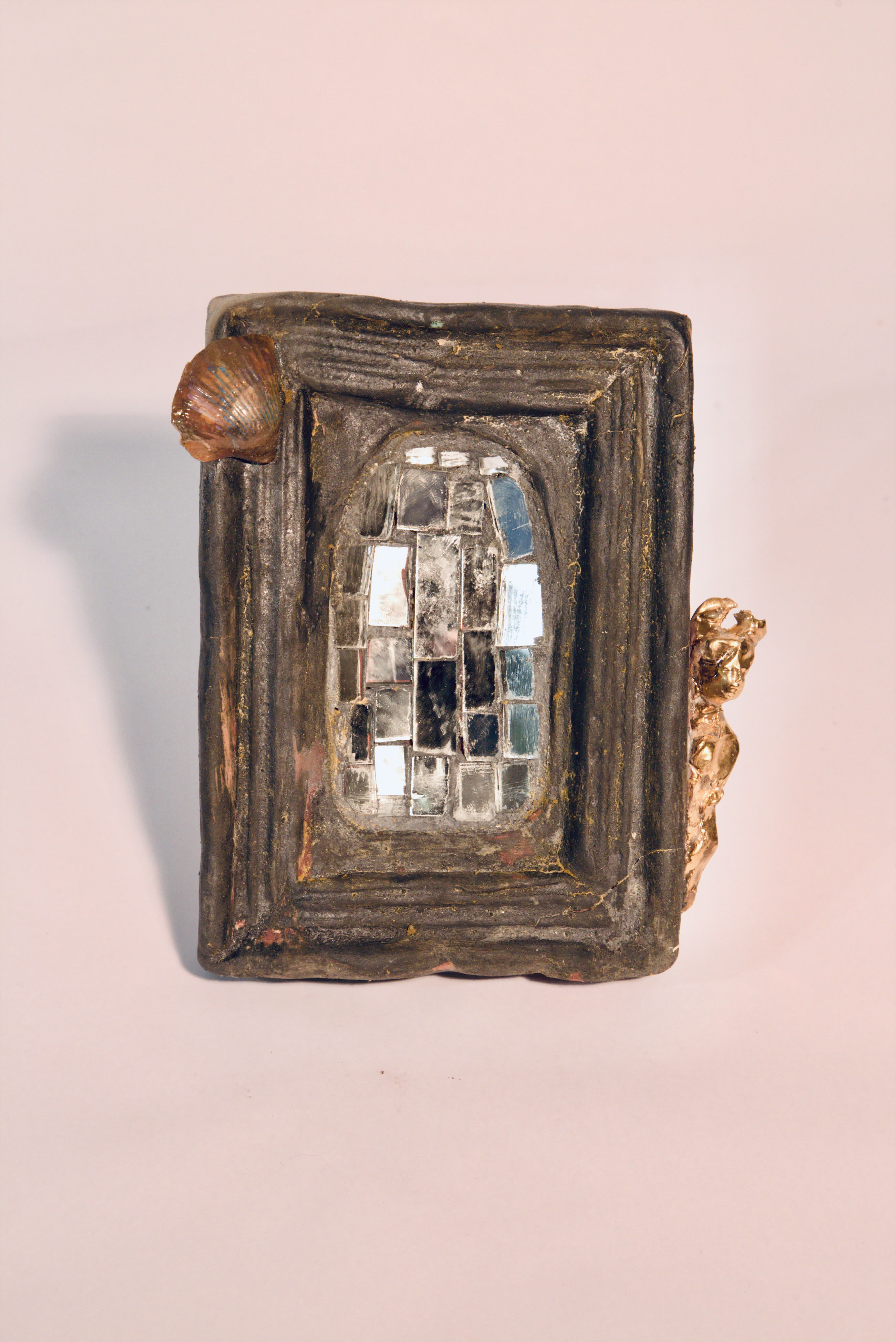 Cornice con mosaico a specchio centrale. Conchiglia su angolo superiore sinistro. Testina dorata lato destro. Cornice nera opaca.