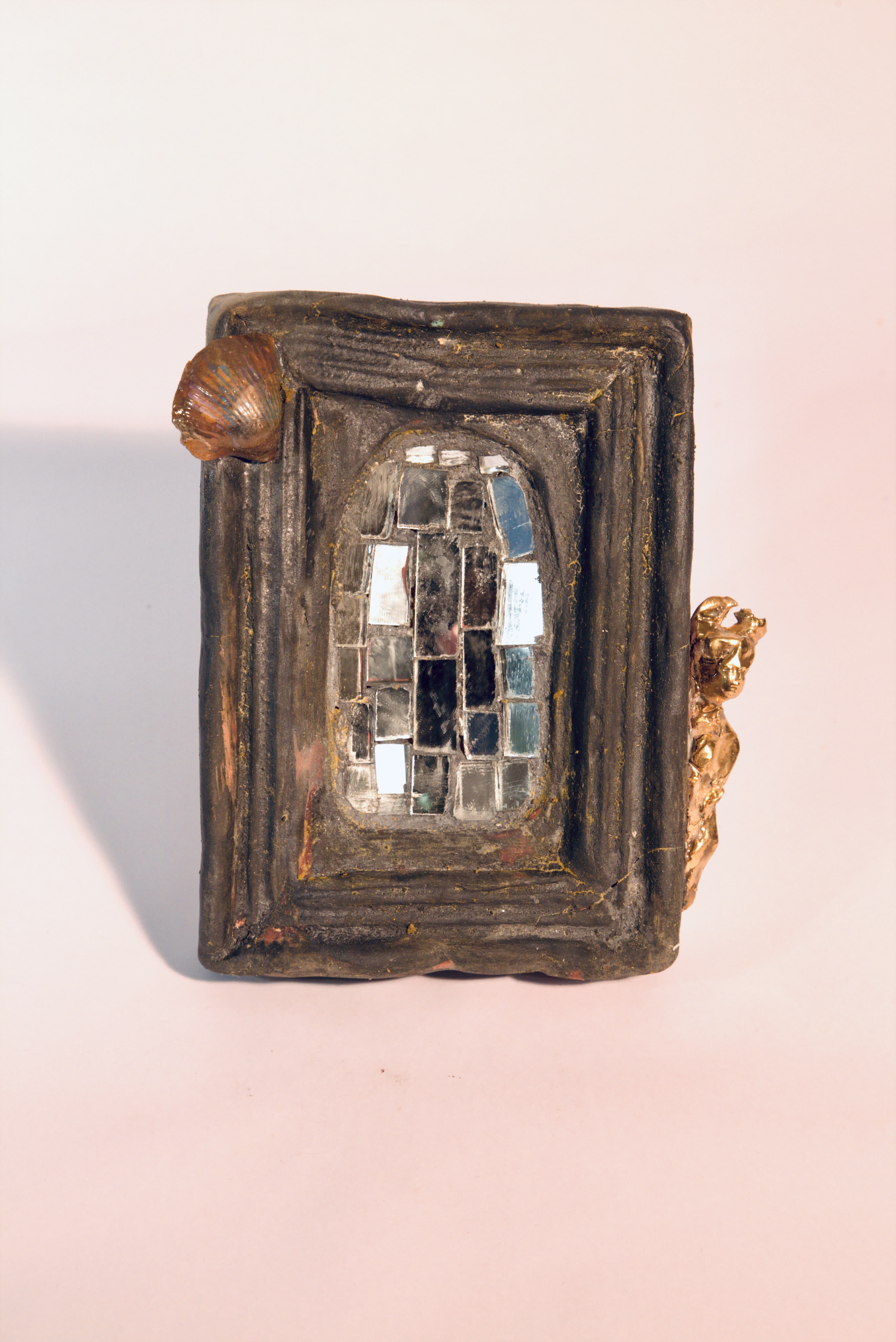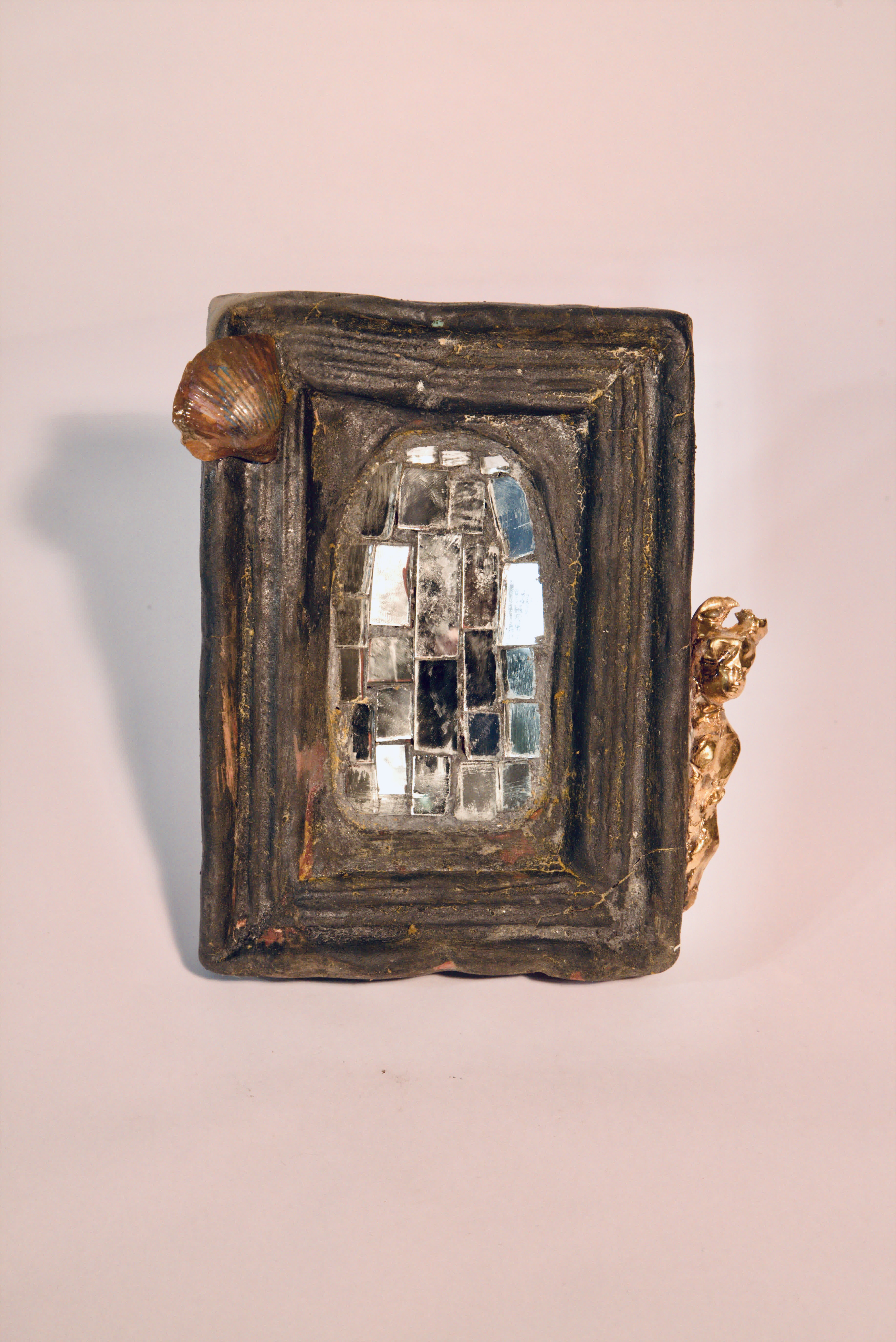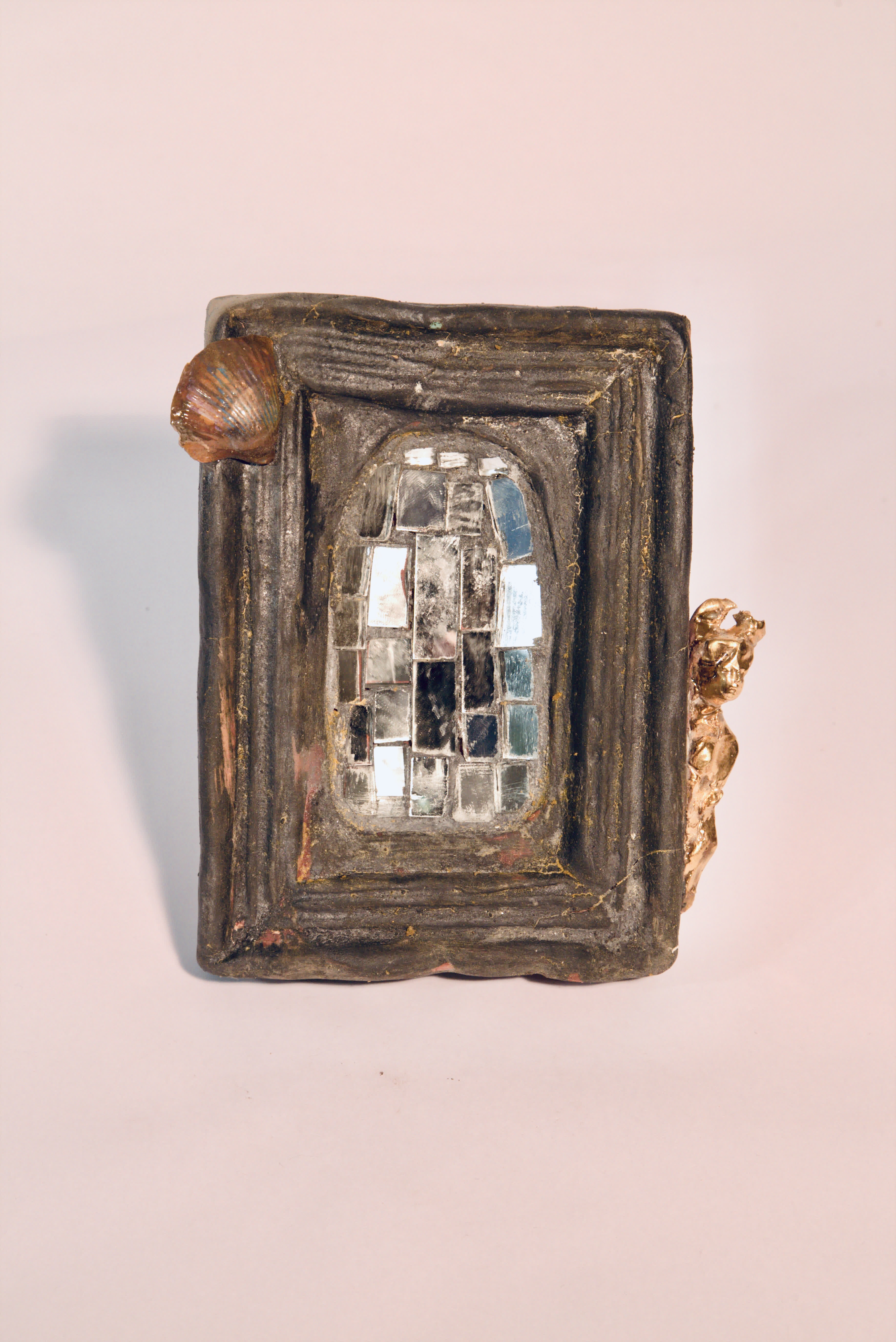 Cornice con mosaico a specchio centrale. Conchiglia su angolo superiore sinistro. Testina dorata lato destro. Cornice nera opaca.