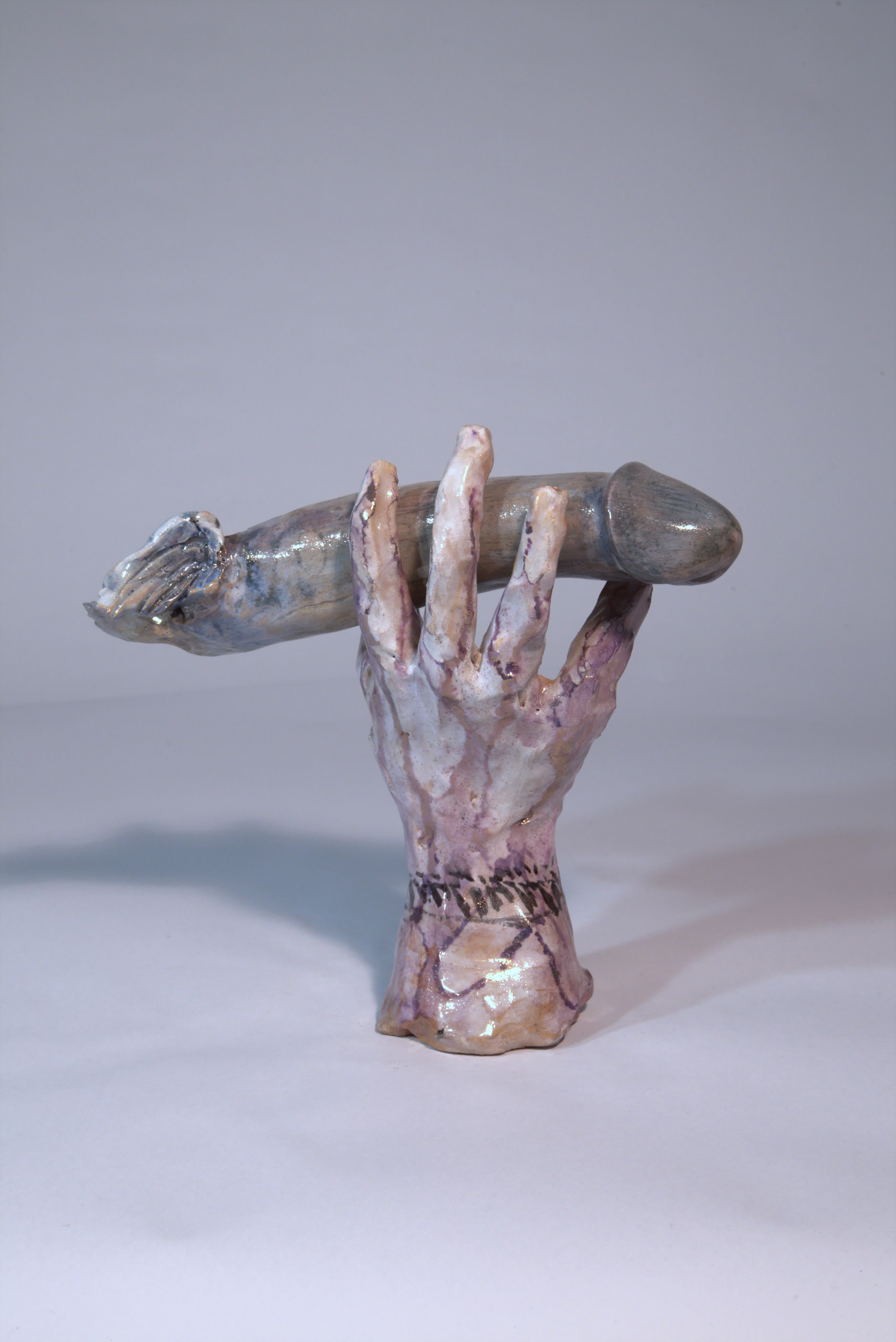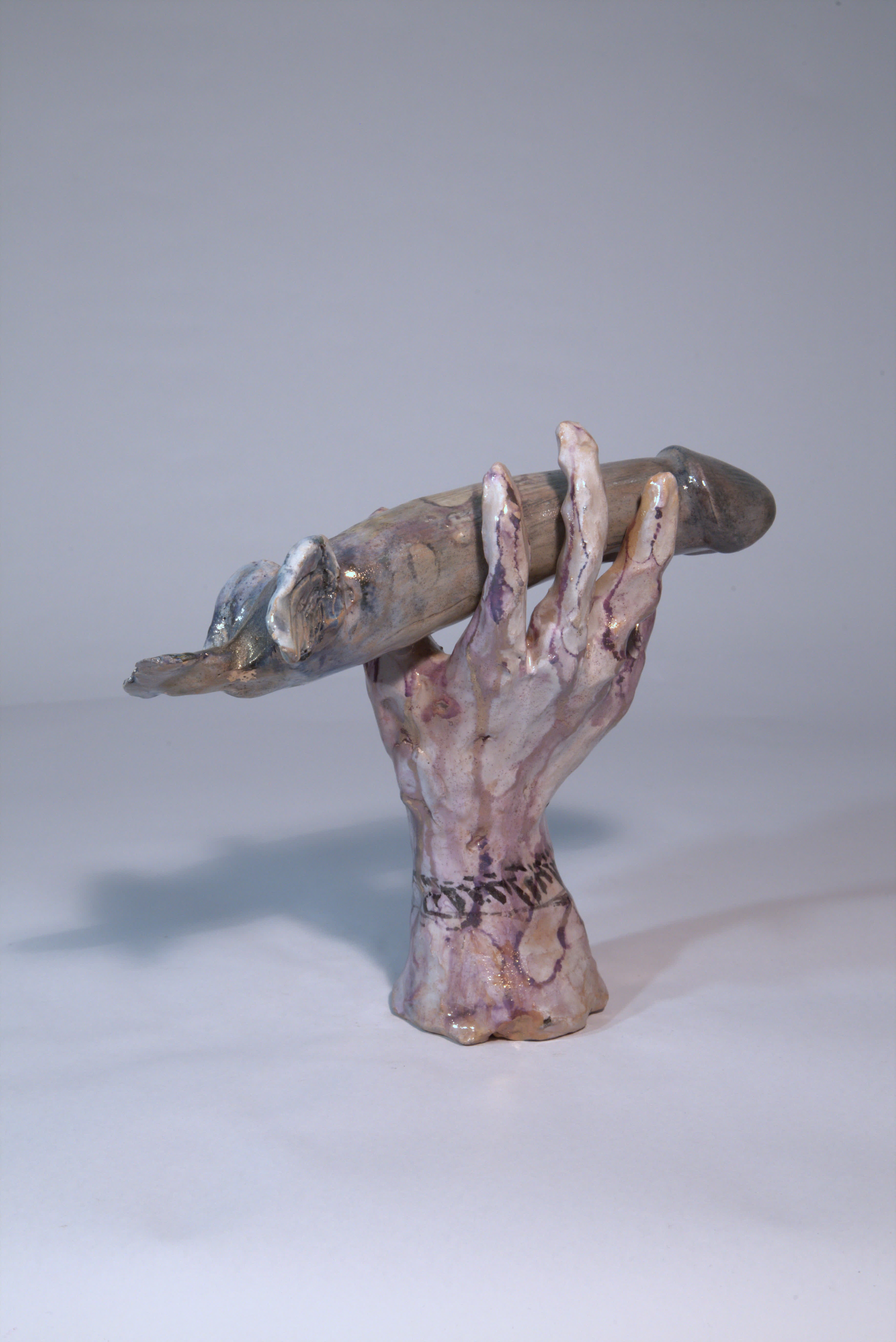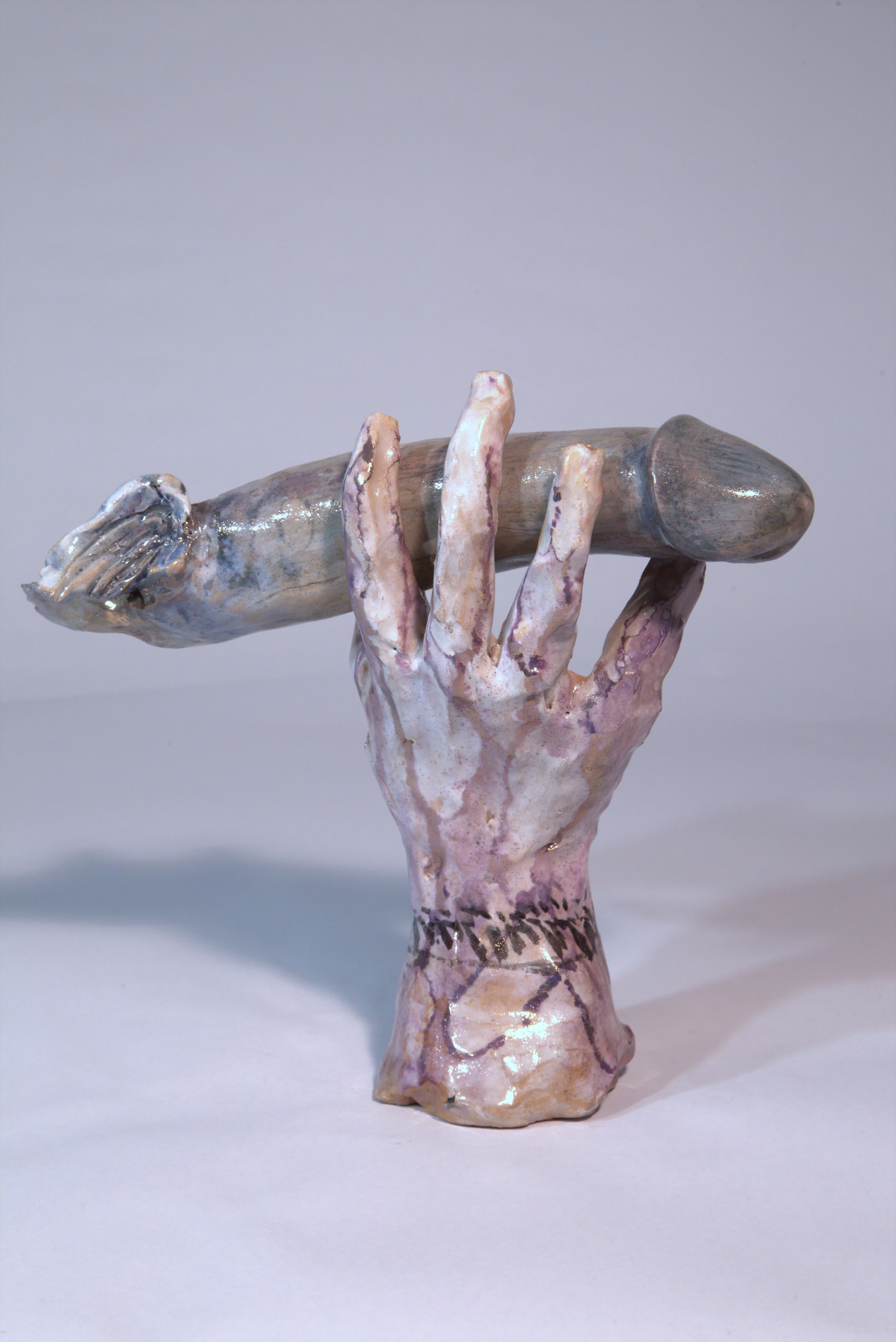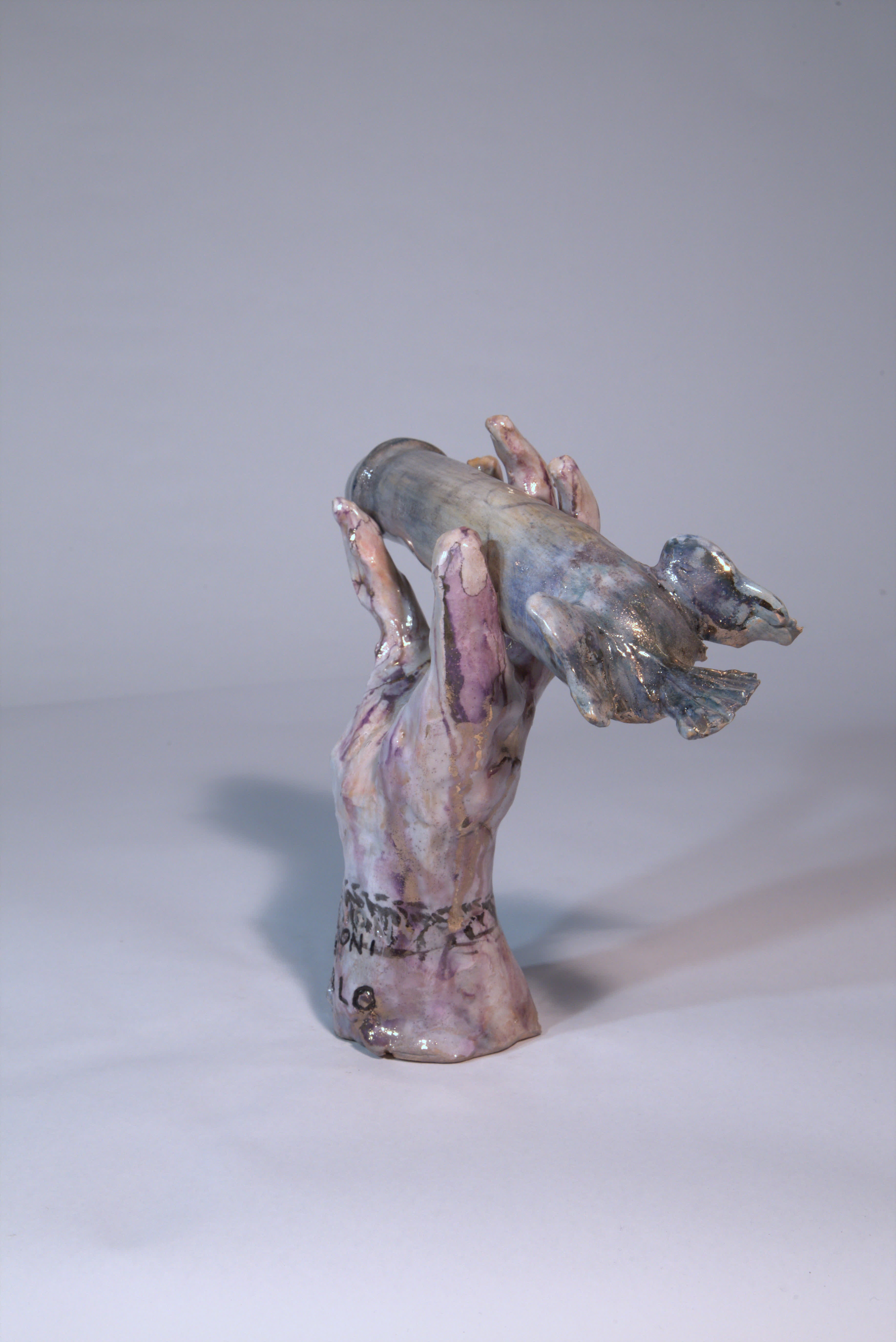 scultura a foggia di mano destra che trattiene (incollato a freddo) un membro virile con coda e alette. Il titolo “lezioni di volo” è prima inciso e poi dipinto a terzo fuoco con colore scuro. La mano è smaltata in bianco e poi a terzo fuoco dipinta con una diffusa iridescenza violetto e colature/riflessi dorati, e un braccialetto di colore scuro. Il membro ha un fondo chiaro poi con velature bliu e violette e tocchi in oro terzo fuoco sulle ali e la coda. Si intravvede un numero (20?) sul fusto.