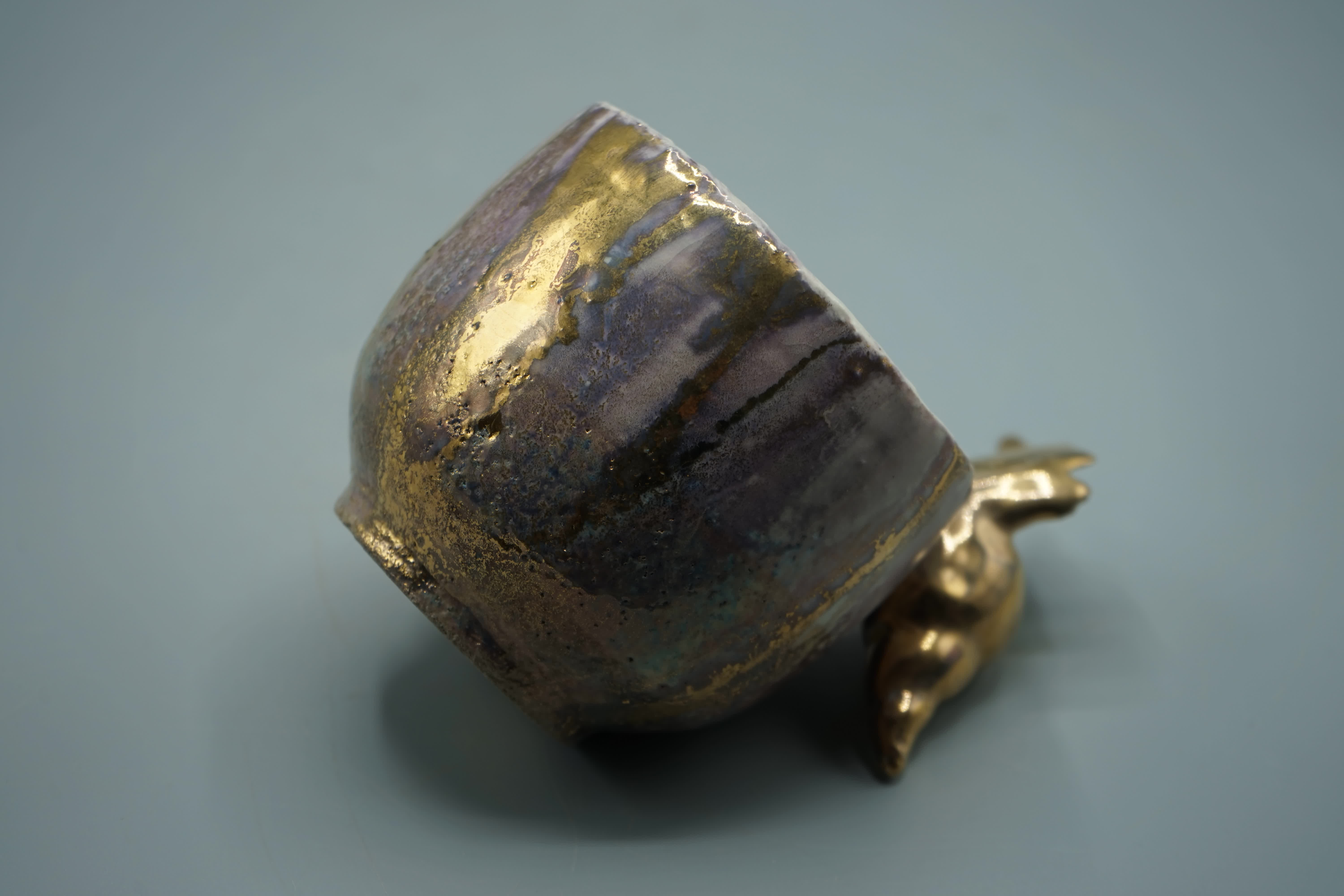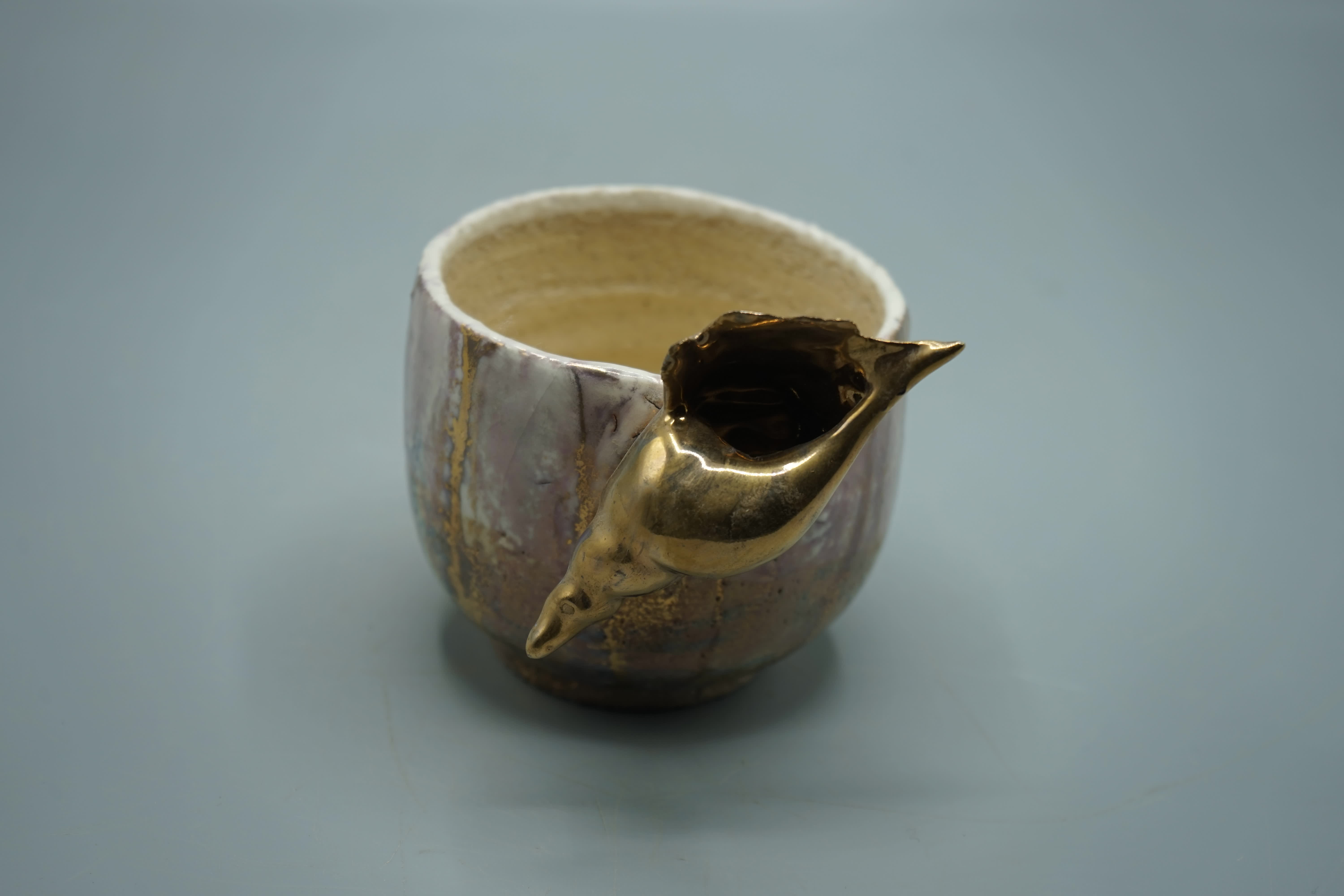 tazza in semire parzialmente smaltata, decori oro 3°fuoco, manico conchiglia in porcellana smaltata e oro