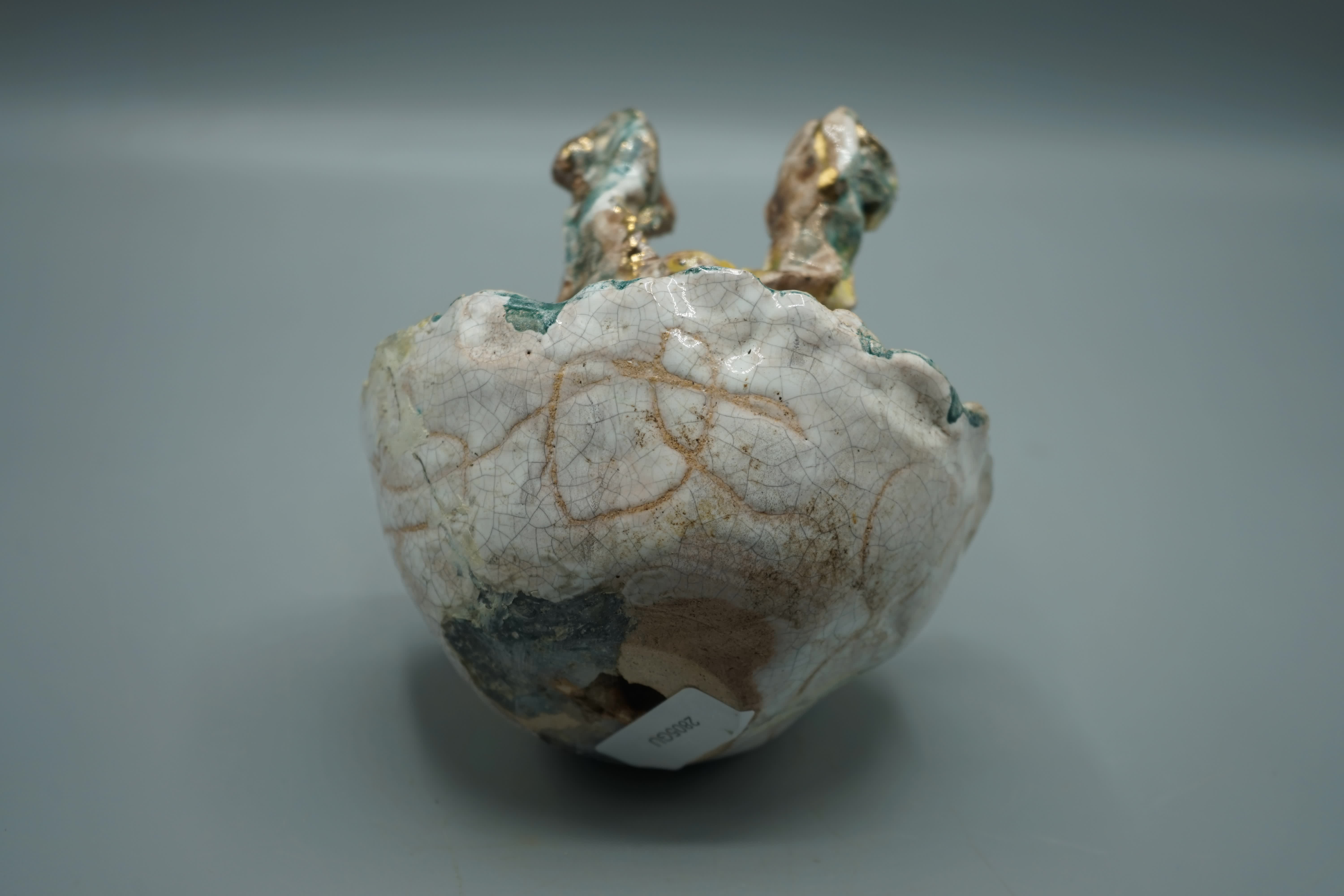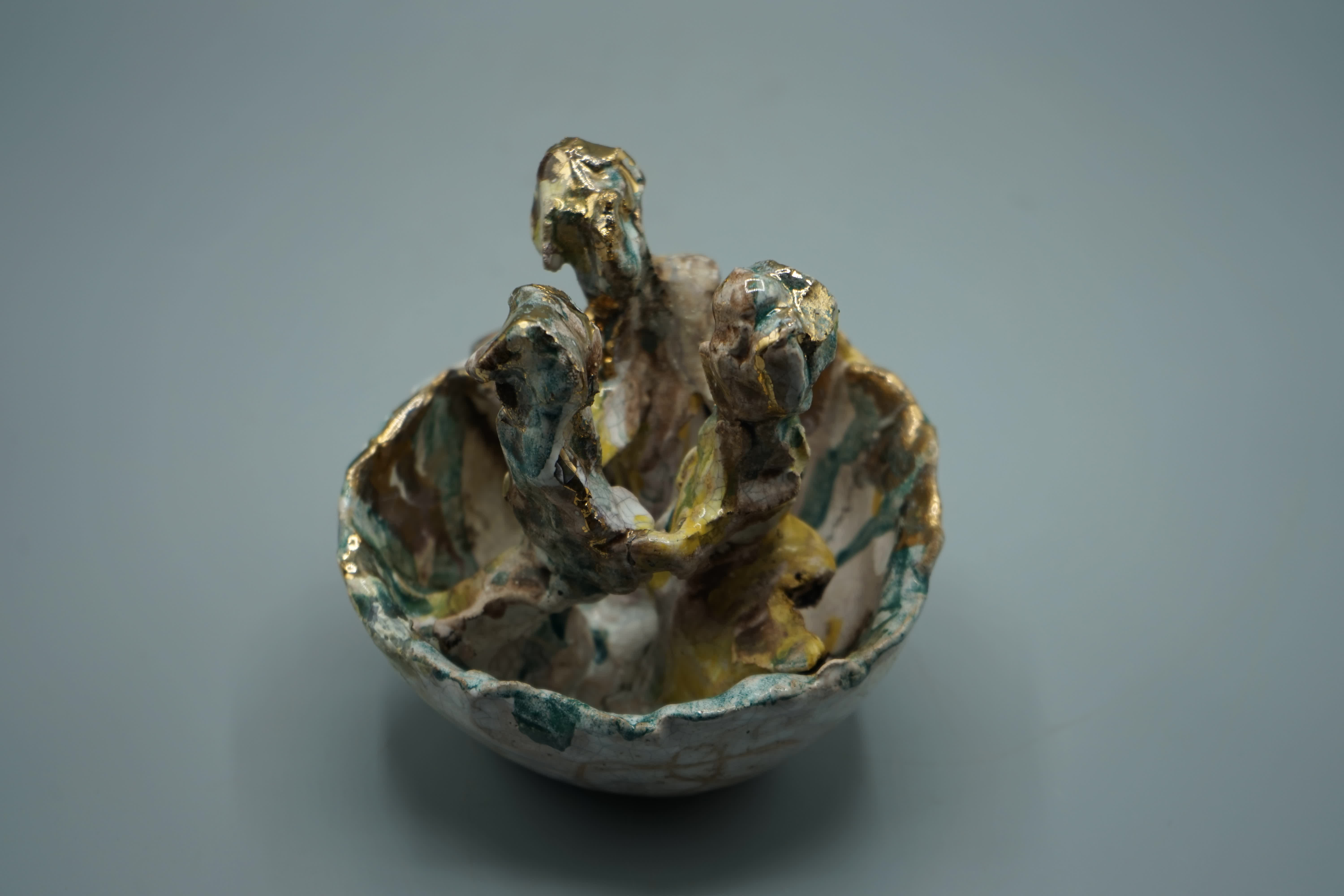 tazza in semire parzialmente smaltata, decori oro 3°fuoco, manico conchiglia oro in porcellana