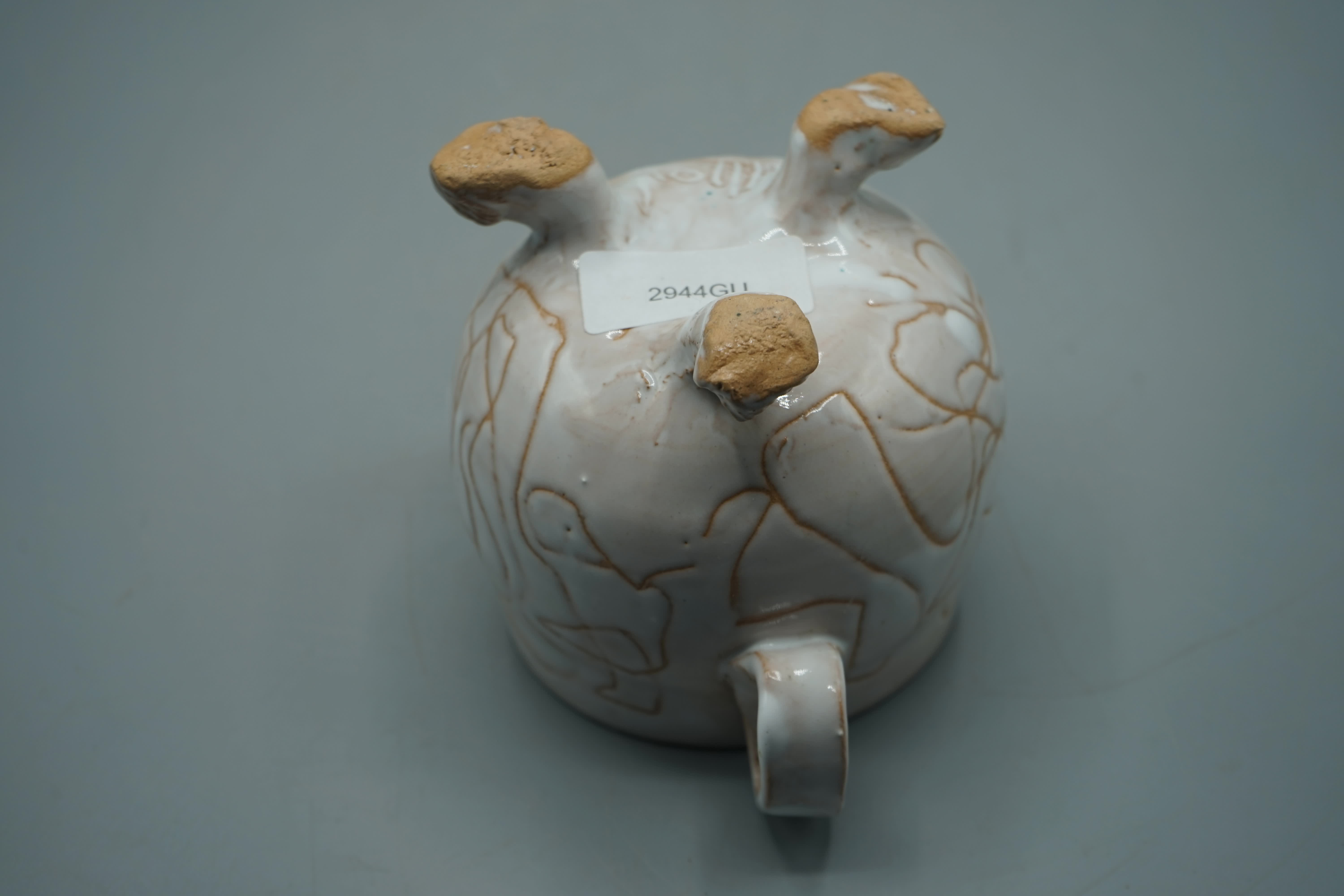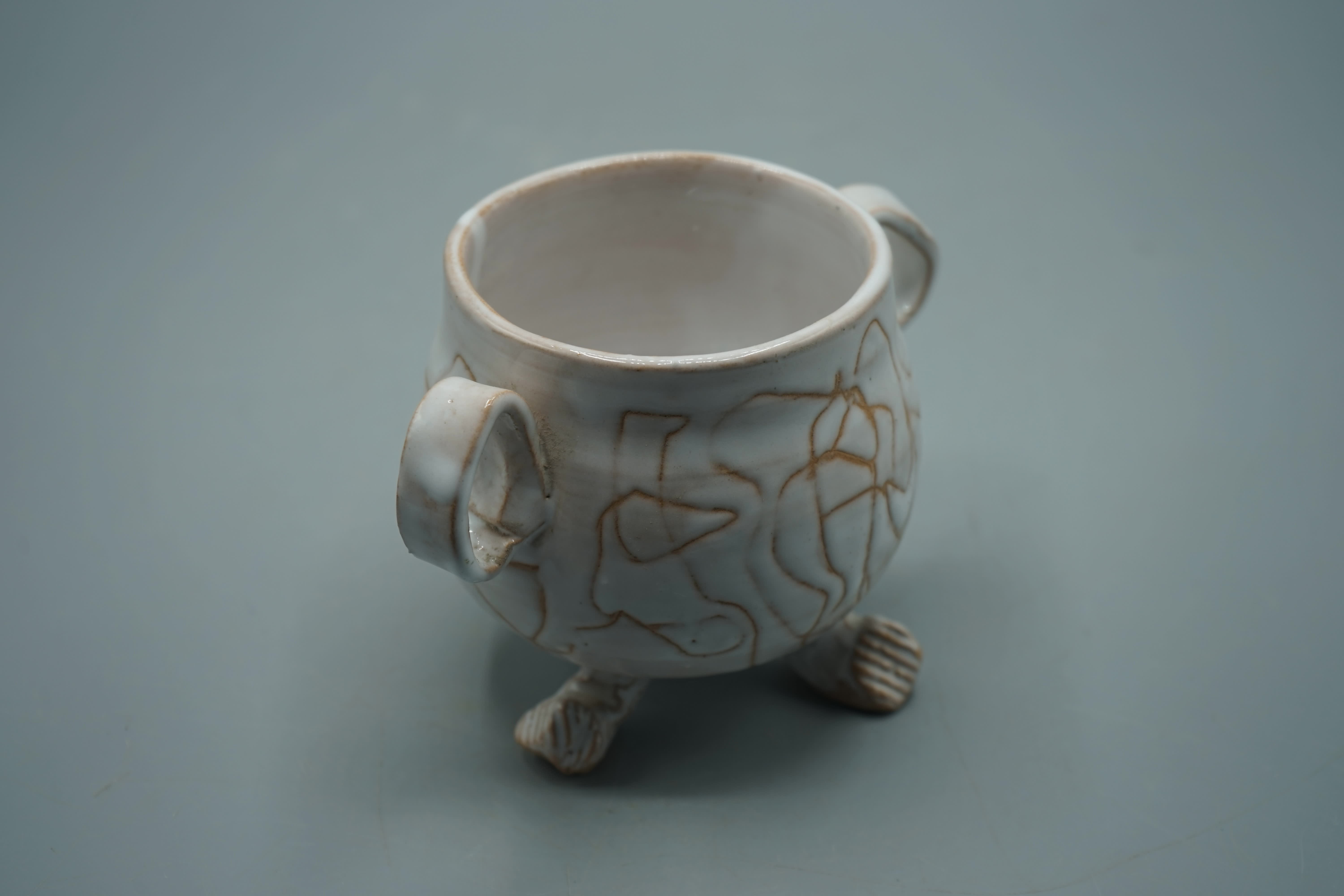tazza in terracotta smaltata e graffita con doppio manico su trepiedi