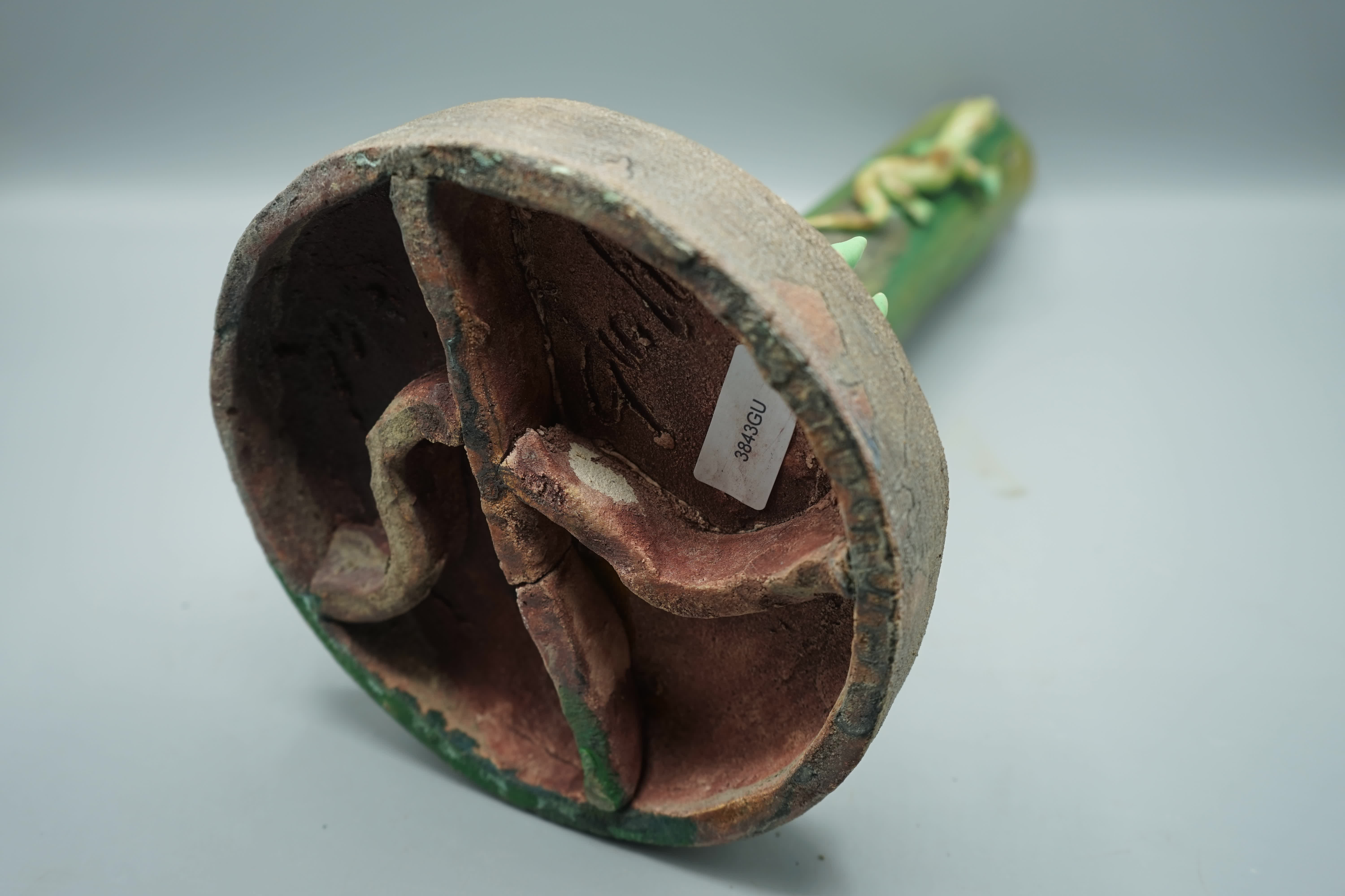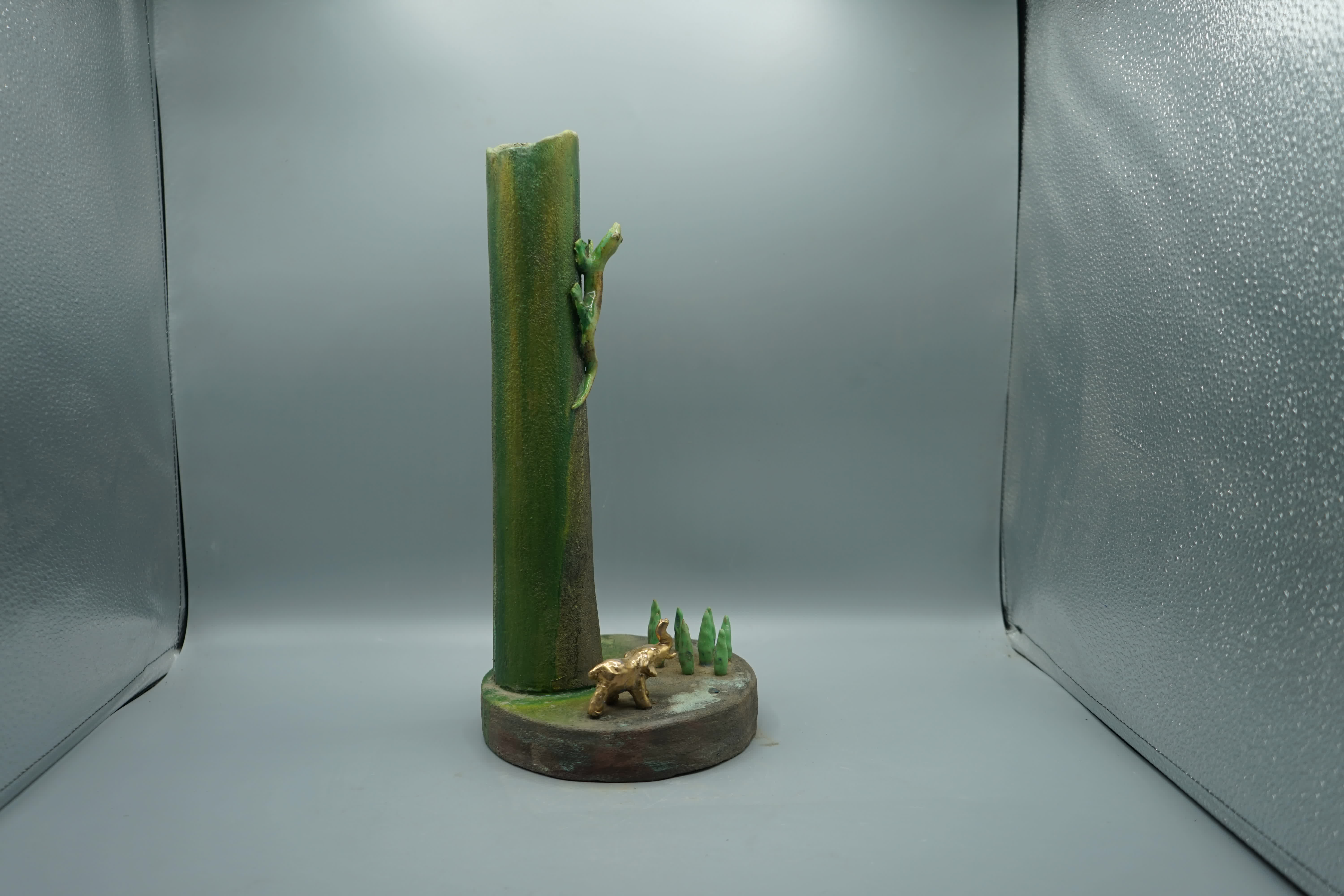isole torre con geco e 10 mini cipressi su base circolare terracotta ingobbiata e parzialmente smaltata, elefante terracotta smalto oro 3°fuoco