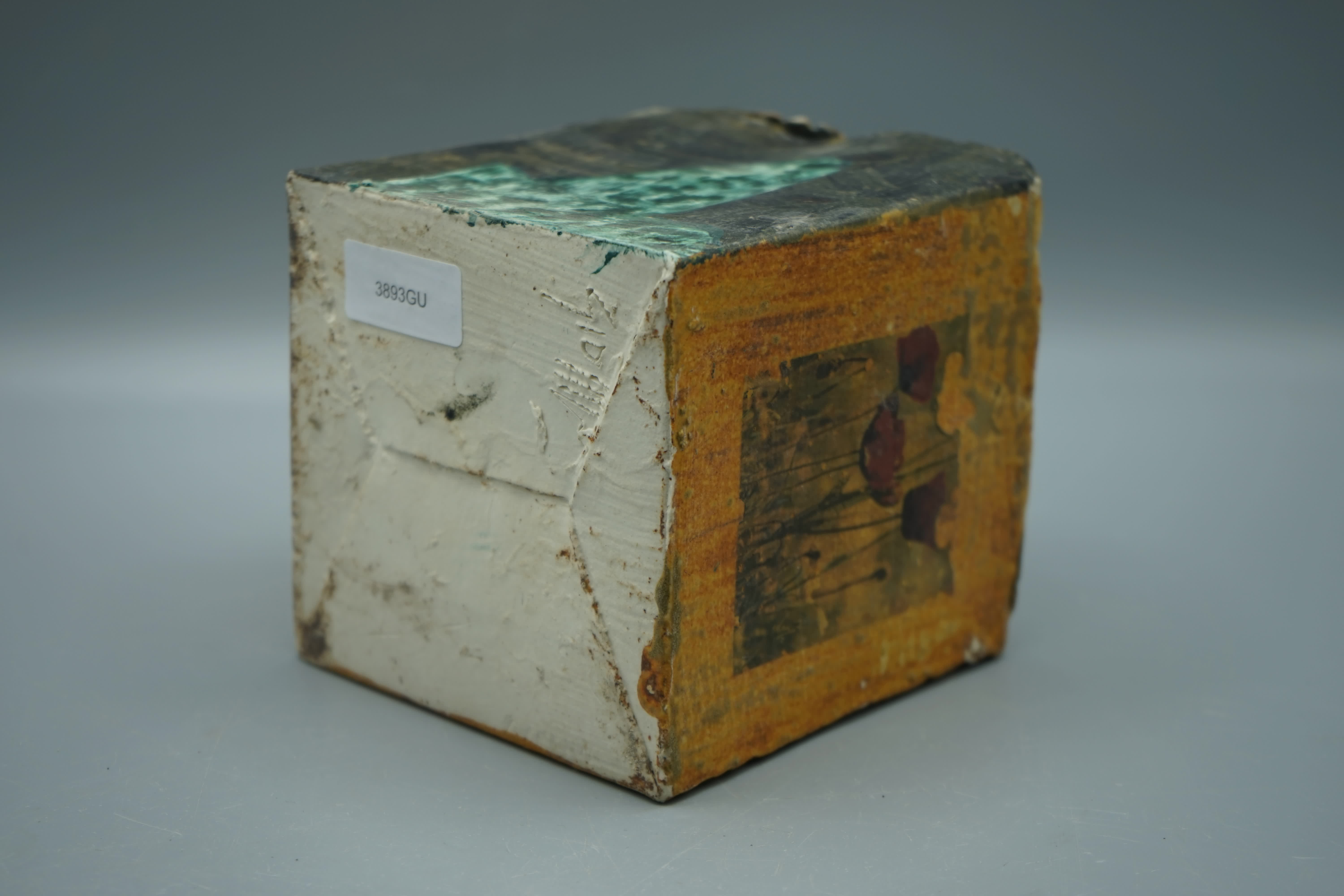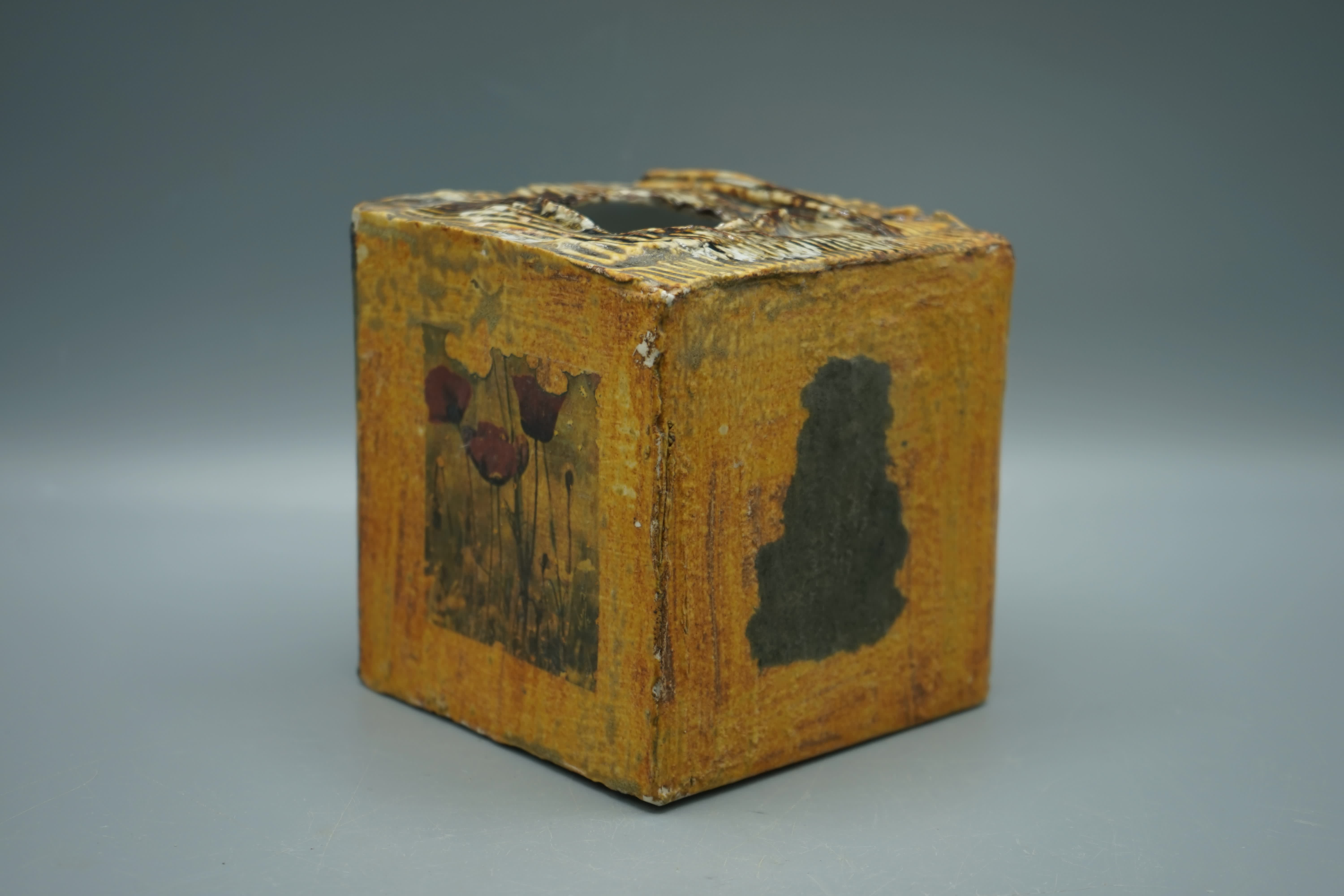 scatola terraglia ingobbiata, parzialmente smaltata, decorazione geometrica a decalco