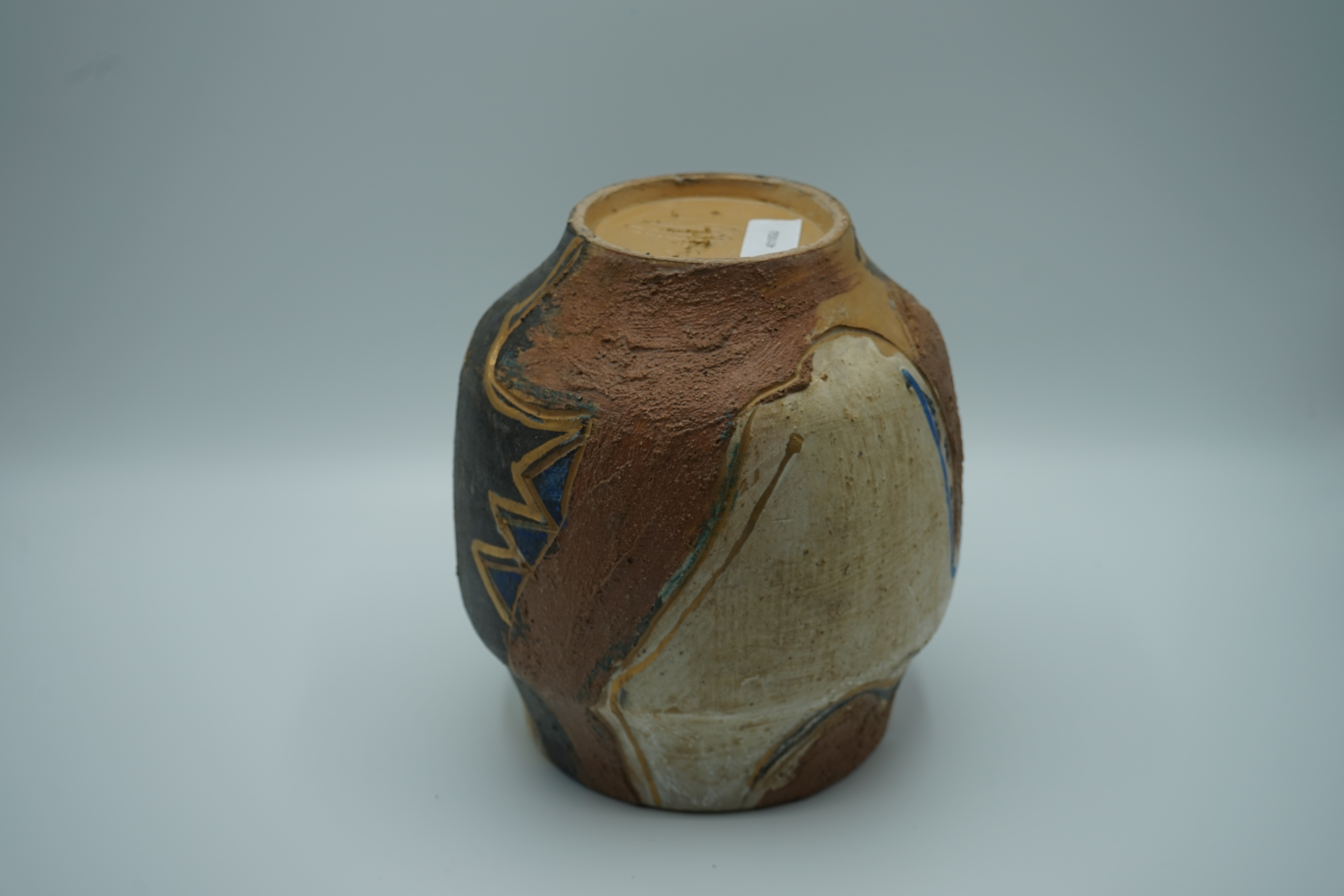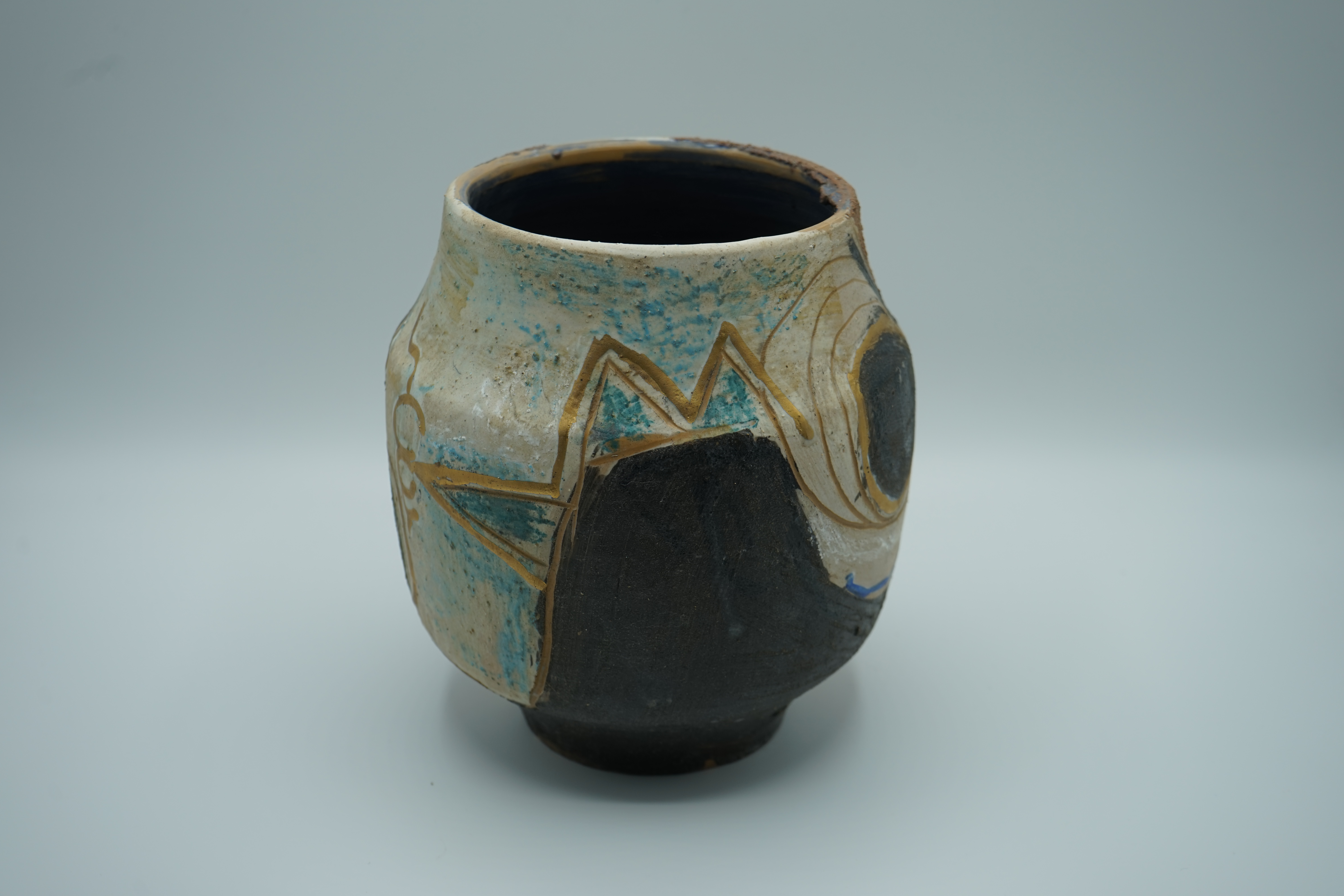 vaso terracotta graffito, ingobbiato e smaltato, decori oro 3°fuoco