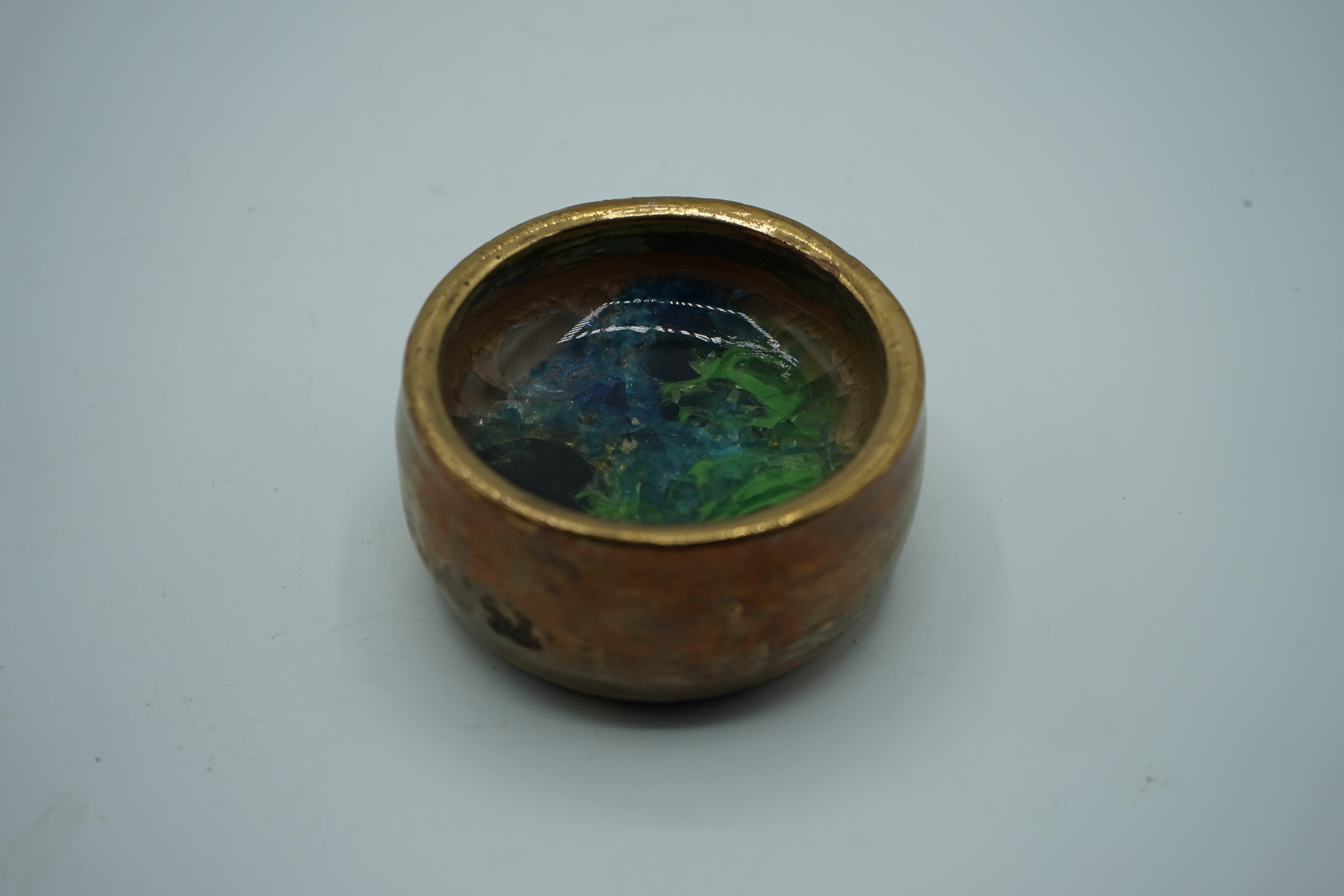 ciotola terracotta smaltata, colature oro 3°fuoco, vetrificazioni all’interno