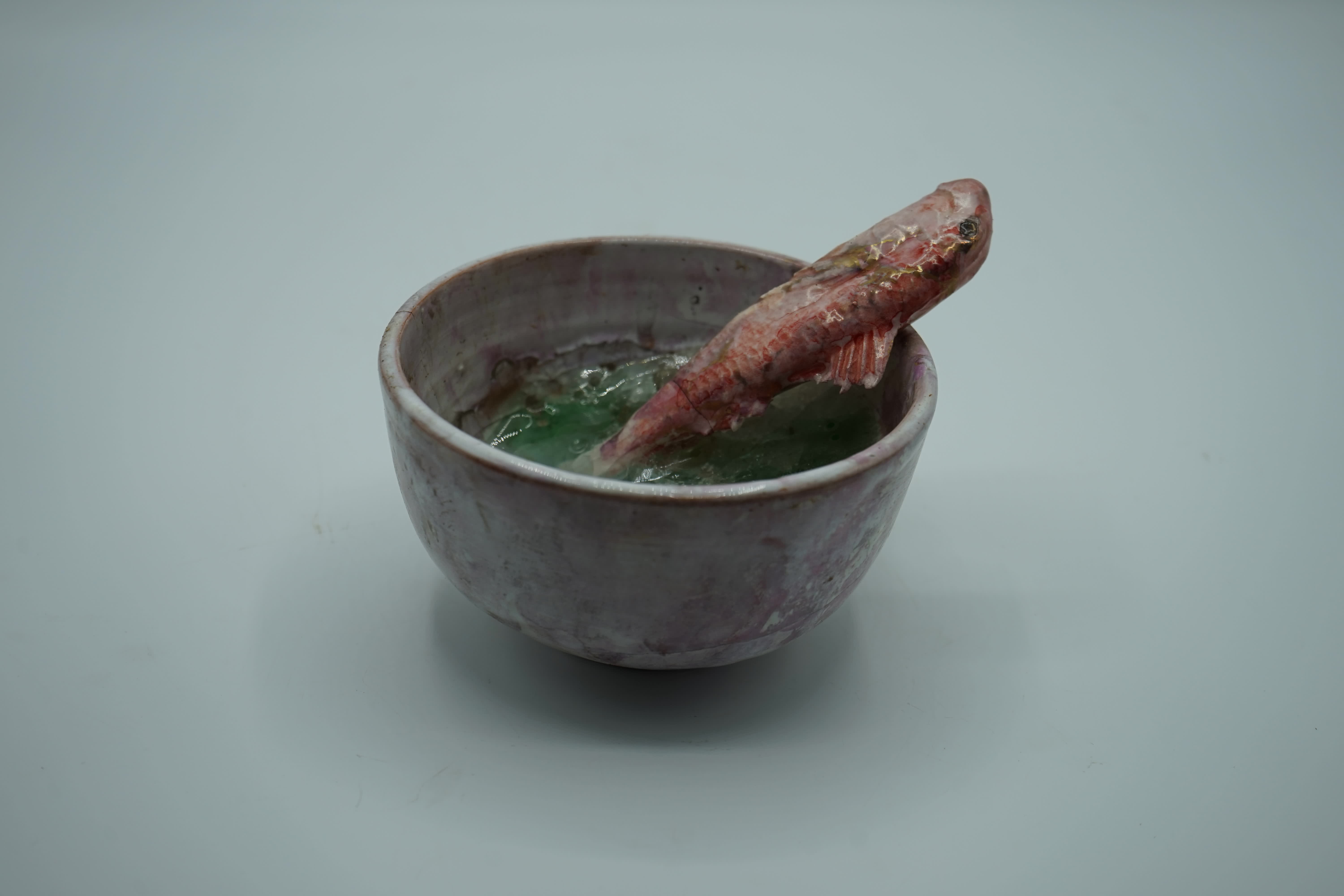 ciotola terracotta smaltata con triglia, dorature oro 3°fuoco, vetrificazioni