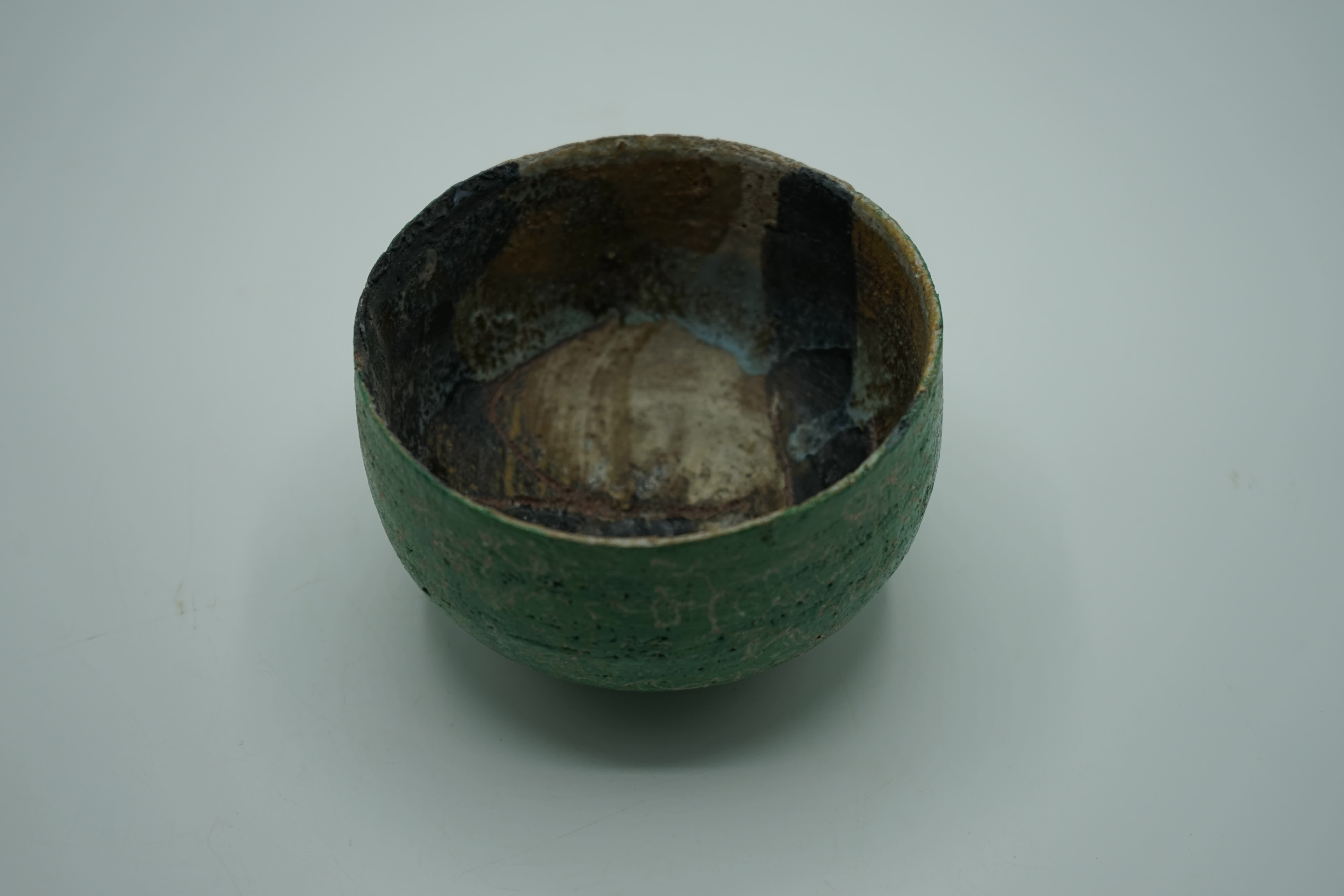 ciotola semire ingobbiato e smaltato internamente, esterno ingobbiato, smaltato e graffito