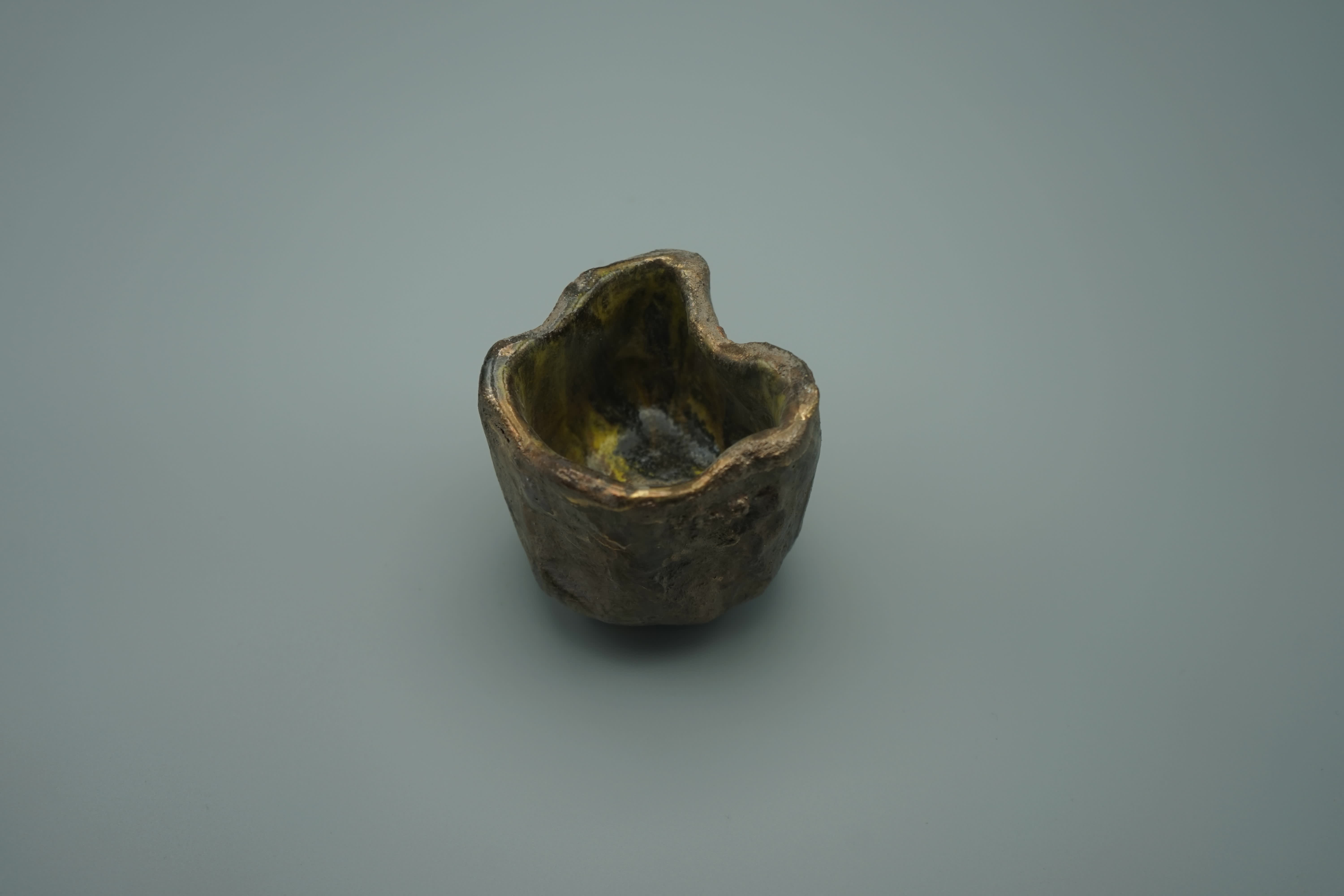 Ciotoa sformata semirefrattario, esterno smaltato con dorature a 3°fuoco, interno smaltato con colature policrome