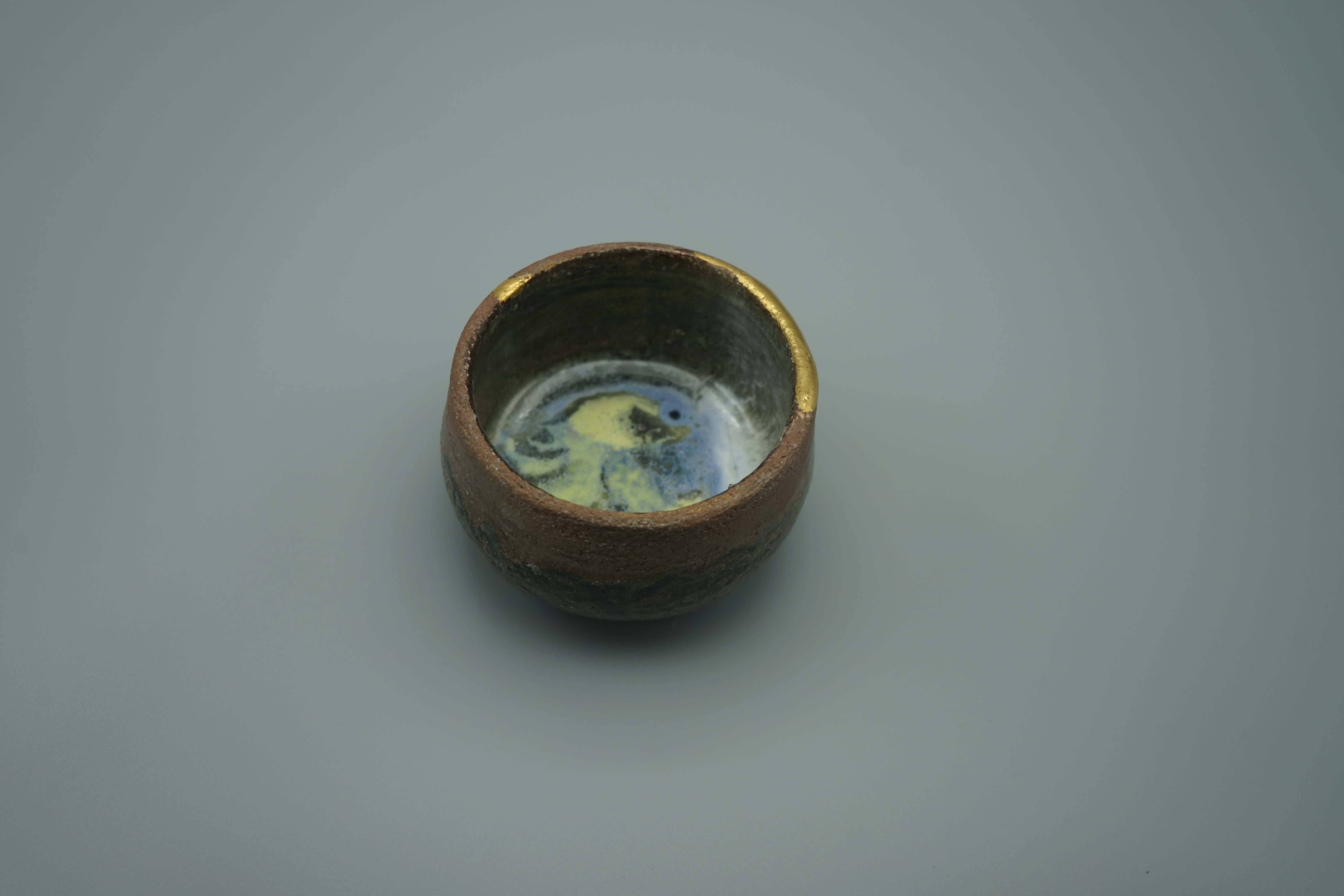Ciotola semirefrattario, esterno decorato a pastelli ceramici con dorature oro 3°fuoco, iterno smaltato a colature policrome