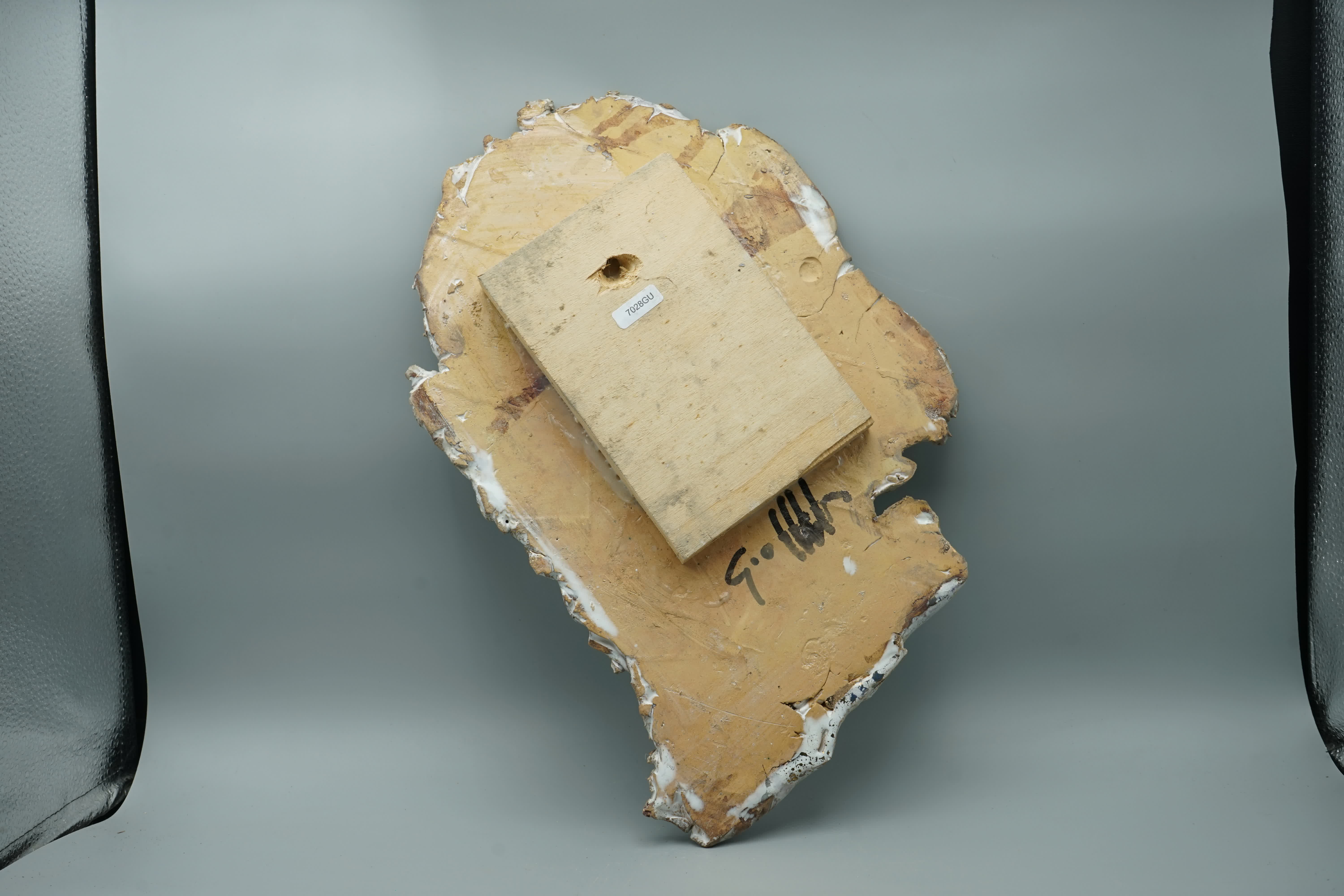 Placca terracotta graffita, ingobbiata e smaltata, decorazione oro 3°fuoco, volto di profilo, supporto legno